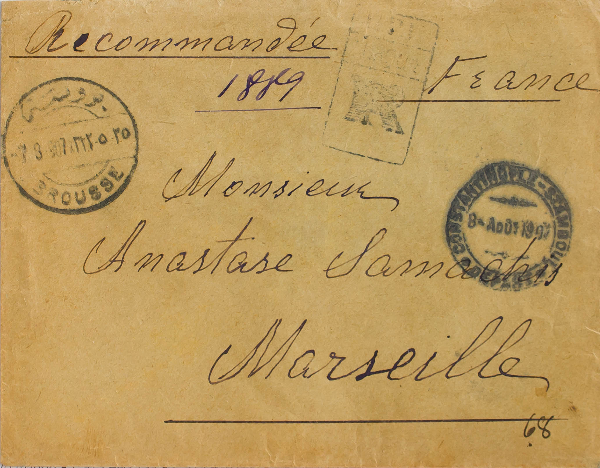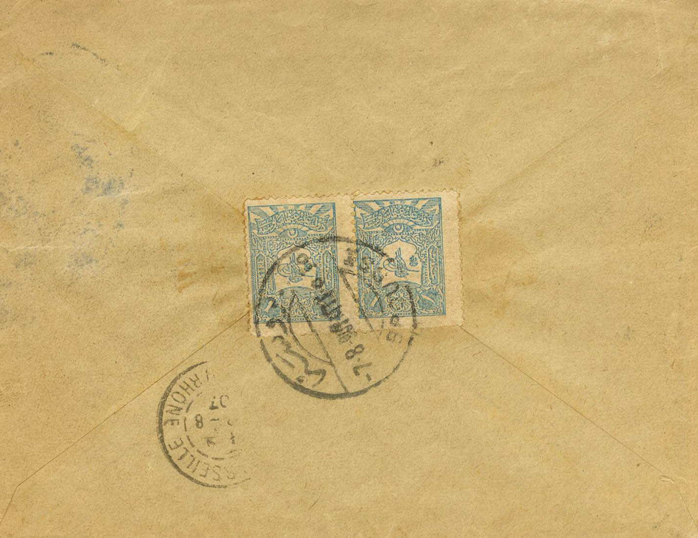 Yvert 109(2). 1907. 1 blue pi, pair. Certificate from BURSA to MARSEILLE. On the front daters BROUSE and *CONSTANTINOPLE-STANBOUL* / DEPART. MAGNIFICENT.
