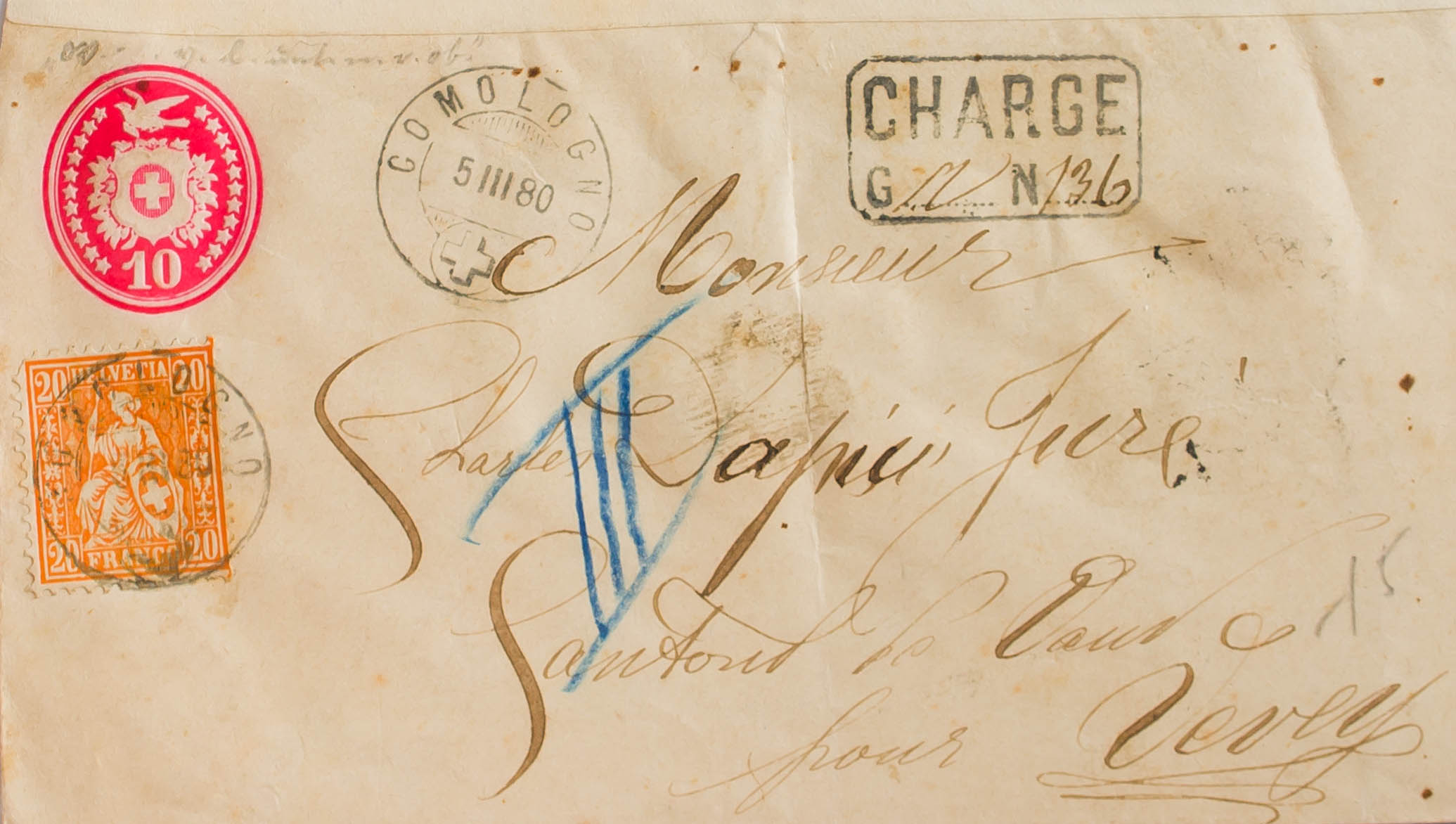 Yvert 37. 1880. 10 cts pink on Certified Postal Stationery from COMOLOGNO to VEVEY, with complementary postage of 20 cts orange (short tooth). COMOLOGNO postmark and CHARGE / GN mark, on the front. MAGNIFICENT.