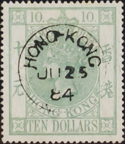 Yvert 7A. 1874. $10 green gray (color slightly softened). Postmark HONG-KONG, in writing ink. MAGNIFICENT AND VERY RARE, FISCAL USE LIKE ALL KNOWN EXEMPLARS. Certificate RPSL. (SGF6 £11,000) Yvert 2010: €16,000