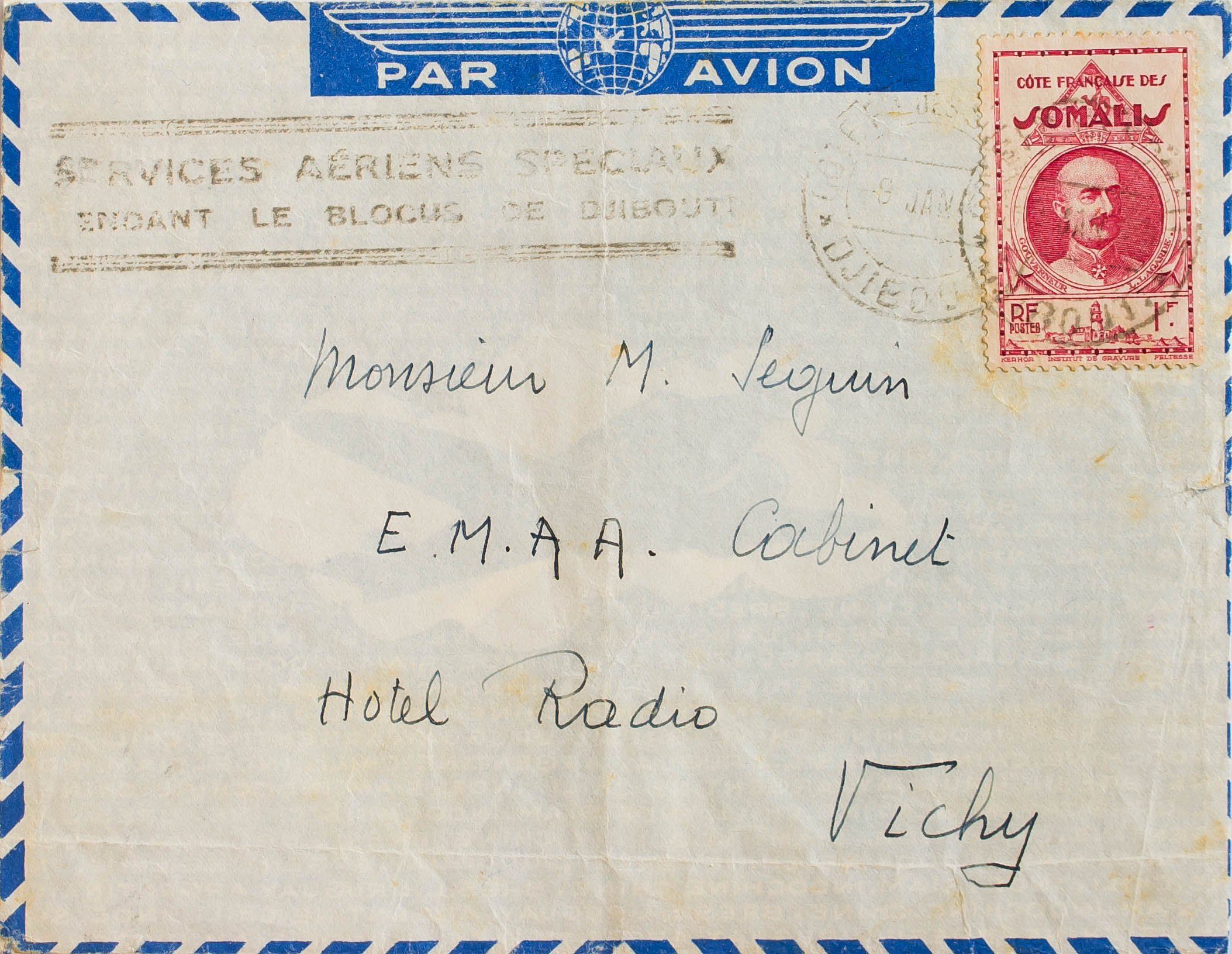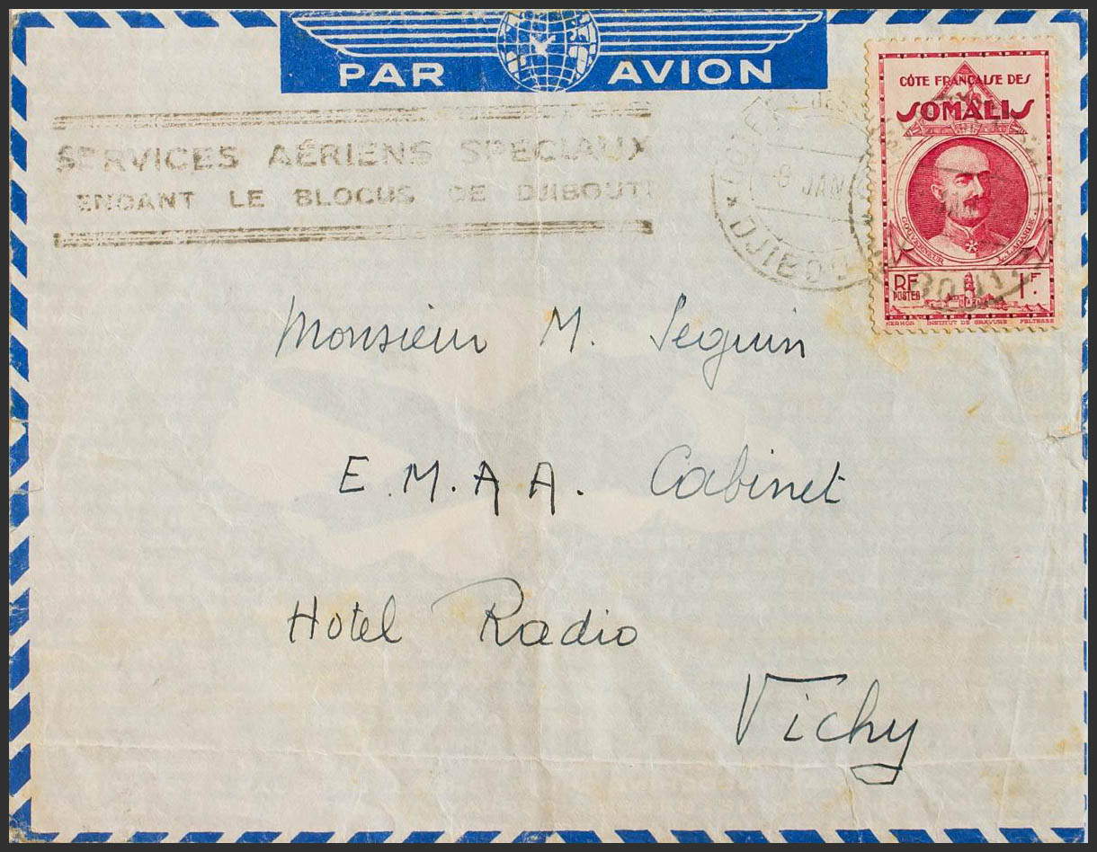 Yvert 162. 1941. 1 fr carmine pink. DJIBOUTI to VICHY (FRANCE). On the front it marks SERVICES AERIENS SPECIAUX / PENDANT LE BLOCUS DE DJIBOUTI, after June 1940 and as a result of Djibouti's support for the Vichy Government, it is subjected to a very severe British blockade. MAGNIFICENT AND RARE.
