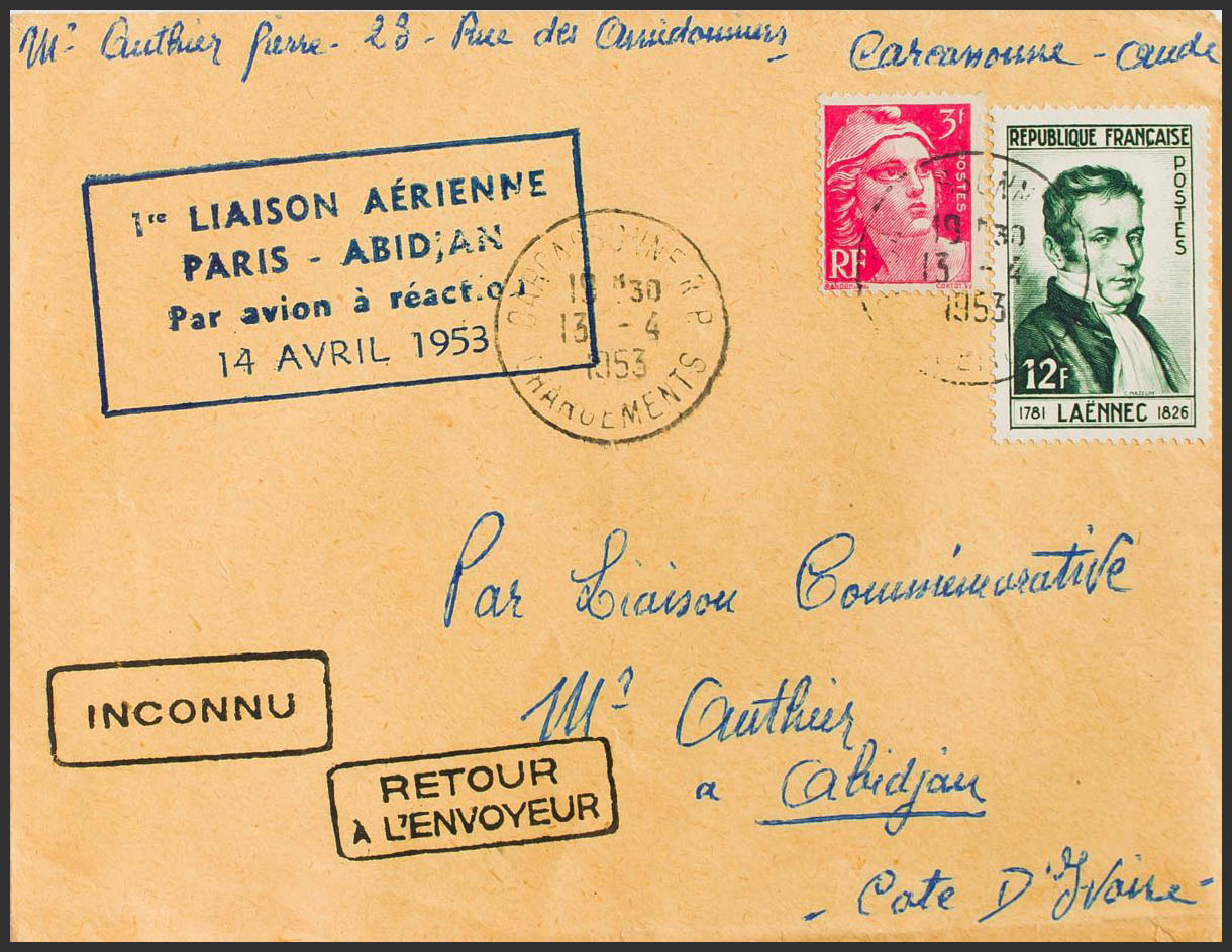 Yvert 936, 806. 1953. 12 fr green and 3 fr pink. Airmail from CARCASSONNE to ABIDJAN (IVORY COAST). On the front it marks 1º LIAISON AERIENNE / PARIS-ABIDJAN / PAR AVION A REACTION, in blue and arrival on the back. MAGNIFICENT.