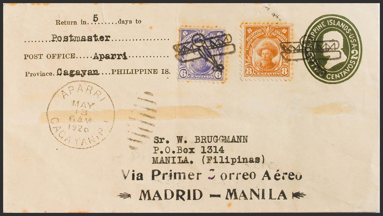 Yvert 206, 207. 1926. 2 cents dark green envelope Postal from APARRI to MANILA, with complementary postage of 6 cents purple and 8 cents bistre (little stains of time). On the back marks RAID MADRID MANILA and MADRID TO MANILA FLIGHT / ACCOMPLISHED BY / SPANISH AVIATORS. MAGNIFICENT.