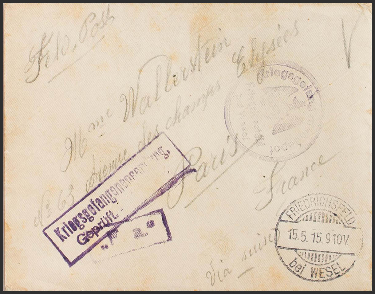 1915. Letter from a French "Prisoner" of War from the FRIEDRICHFELD camp to PARIS (FRANCE). Trademarks KRIEGSSGEFANGEHENDEPOT / FRIEDRICHSFELD / BEIWESEL, in purple. MAGNIFICENT.