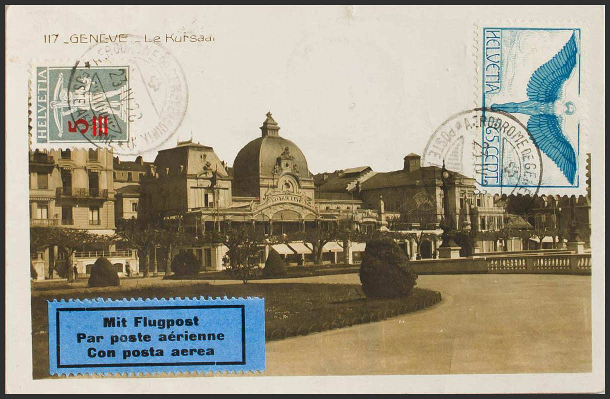 Yvert 10. 1928. 65 cts blue and 5 cts over 7 ½ cts grey. Certified Post Card from GENEVA to PONTARLIER (FRANCE). On the back text "PAR AVION GENEVE-MARSEILLE BARCELONE Iº VOL", and arrival. MAGNIFICENT.