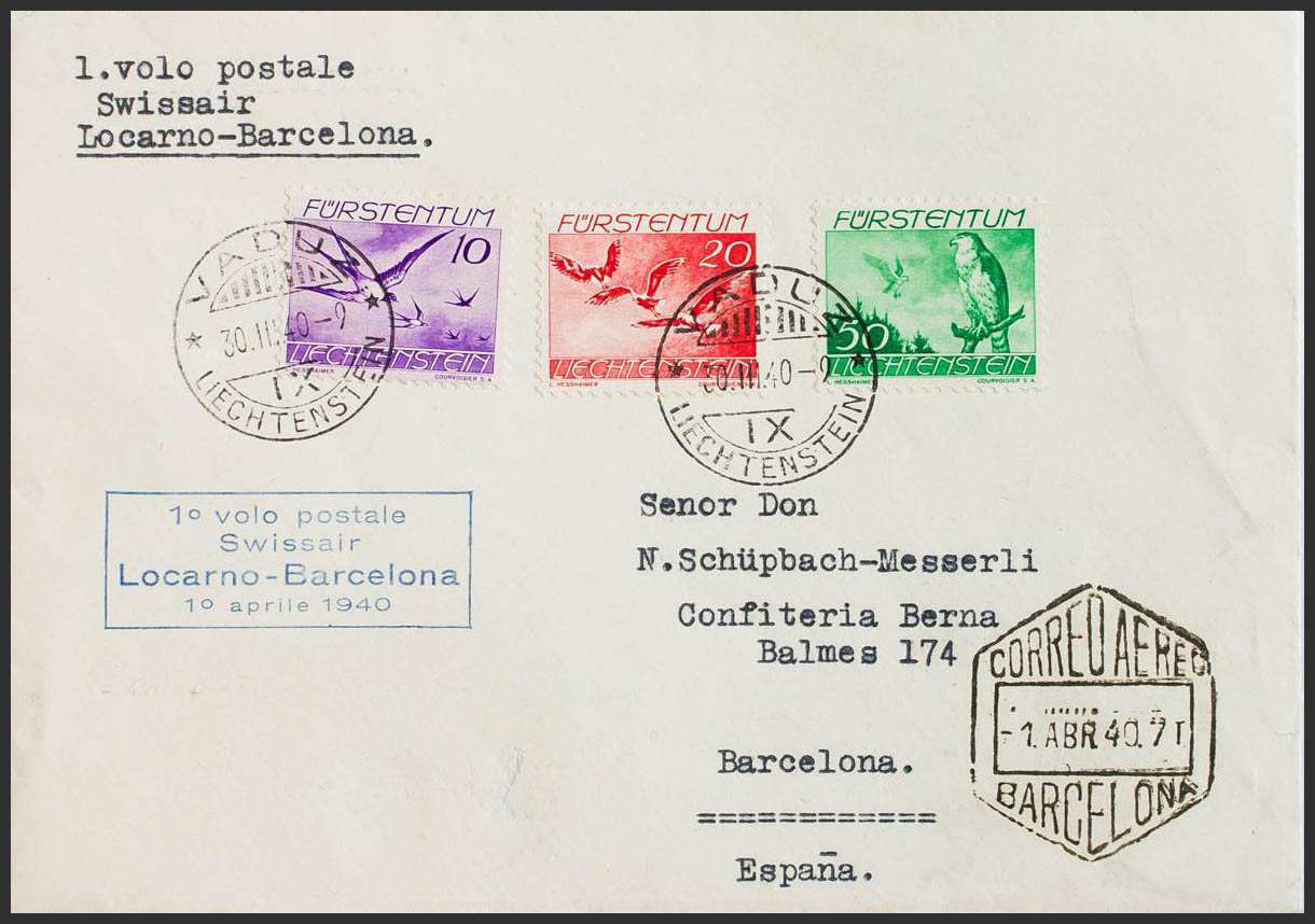 Yvert 17, 19, 21. 1940. 10 r violet, 20 r red and 50 r green. Certificate from VADUZ to BARCELONA. On the front it marks 1º VOLO POSTALE / SWISSAIR / LOCARNO-BARCELONA, in blue and arrival. MAGNIFICENT.