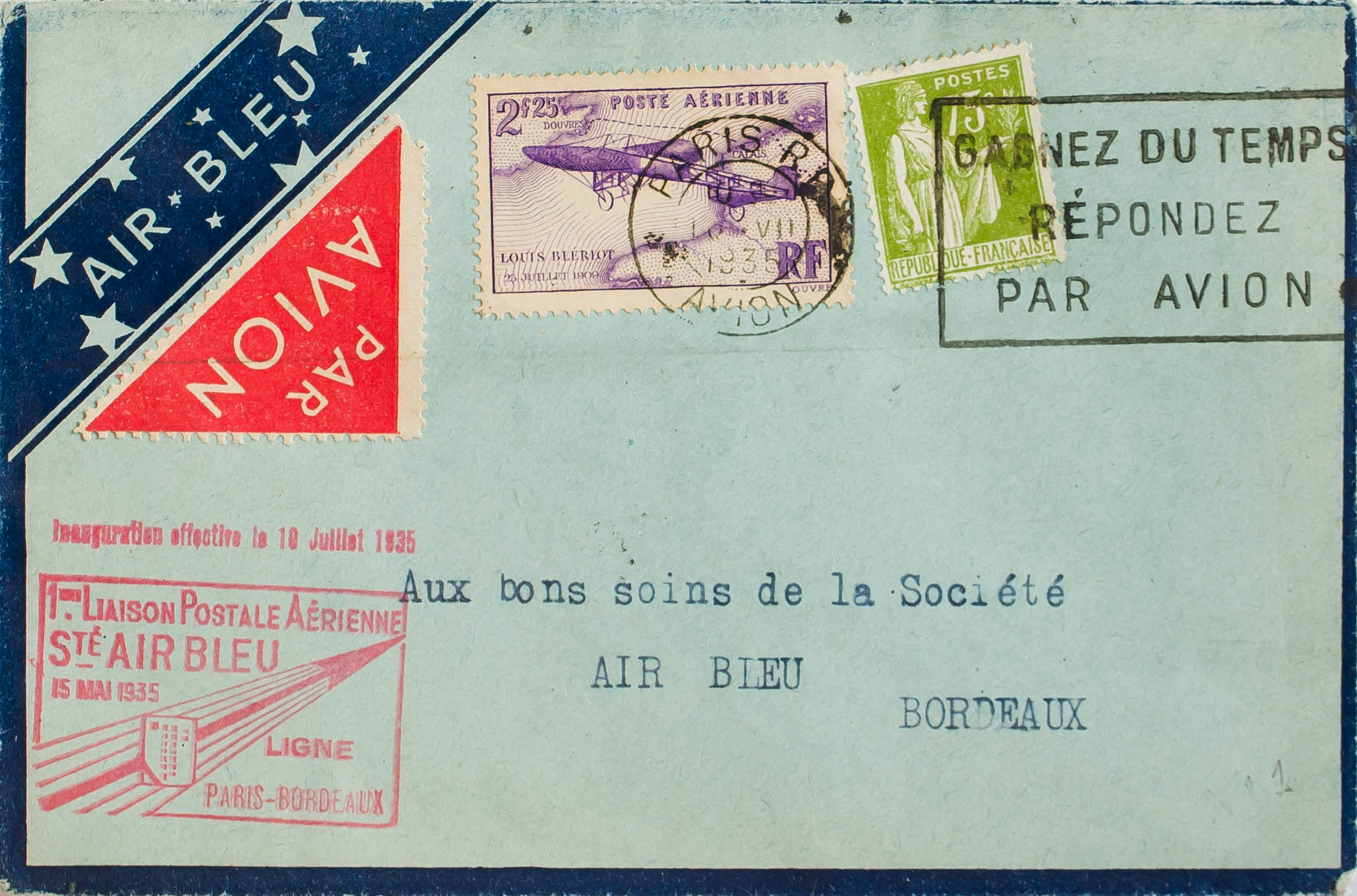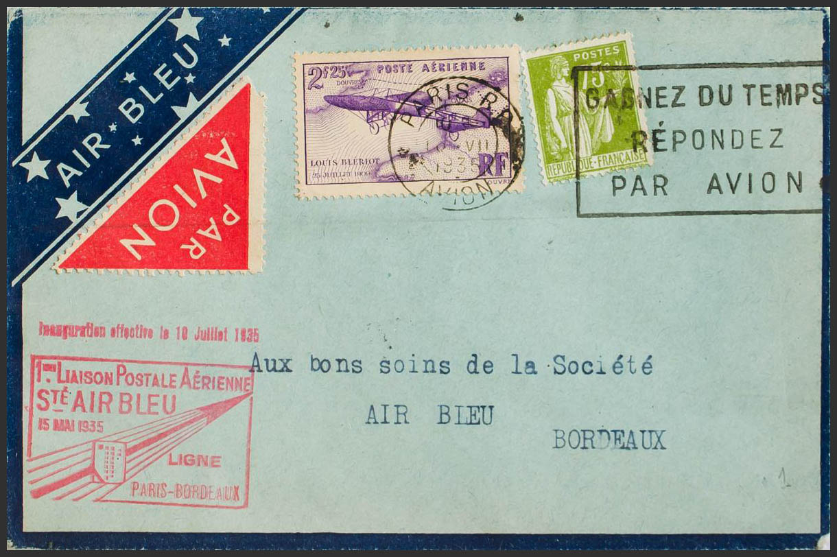Yvert 284A, Aerial 7. 1935. 75 cts olive and 2´25 lilac fr. Air Mail from PARIS to BORDEAUX. On the front mark 1 EME LIAISON POSTALE AERIENNE / STE.AIR BLEU / LIGNE / PARIS BORDEAUX, in red. MAGNIFICENT.