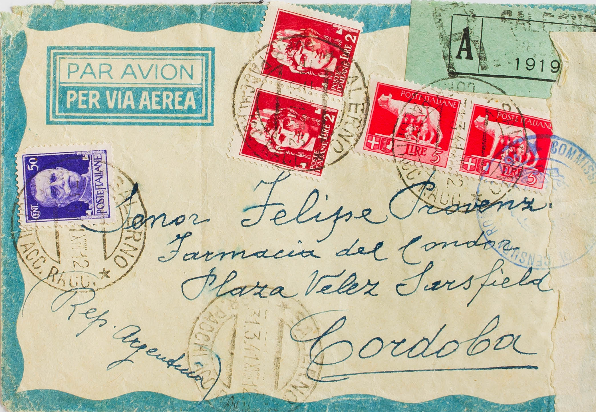 Yvert 232, 236(2), 239(2). 1941. 50 cts violet, 2 l carmine red, two stamps and 5 l rose red, two stamps. Certificate from SALERNO to CORDOBA (ARGENTINA). On the back arrival. MAGNIFICENT.
