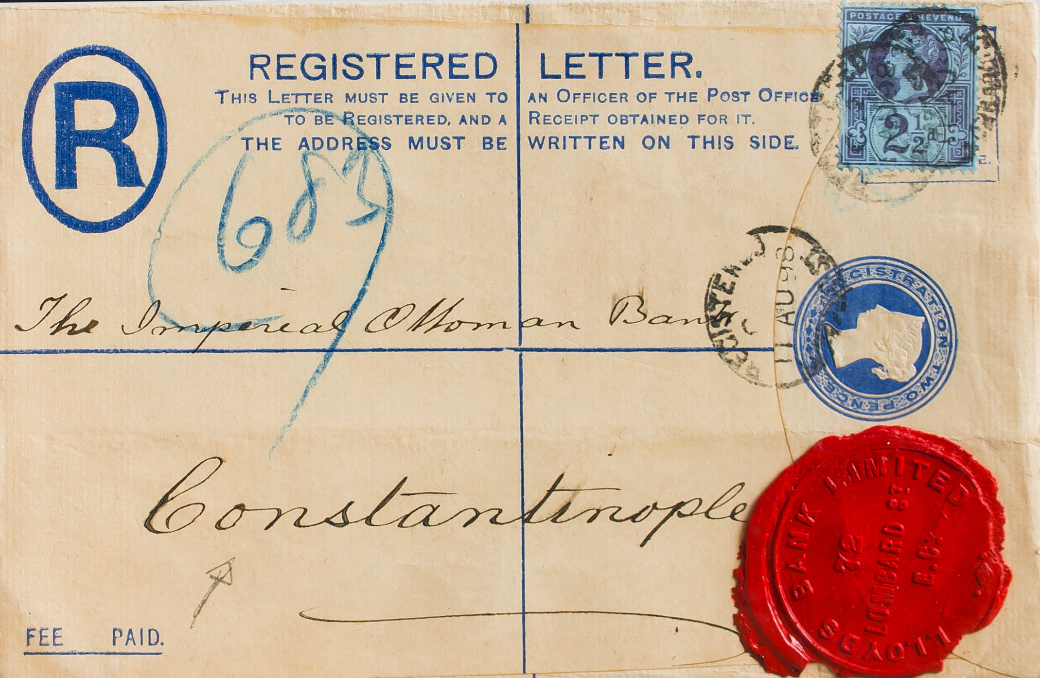 Yvert 95. 1898. 2p overseas Registered Postal Stationery from LONDON to CONSTANTINOPLE, postage supplementary 2 ½p violet on blue. MAGNIFICENT.