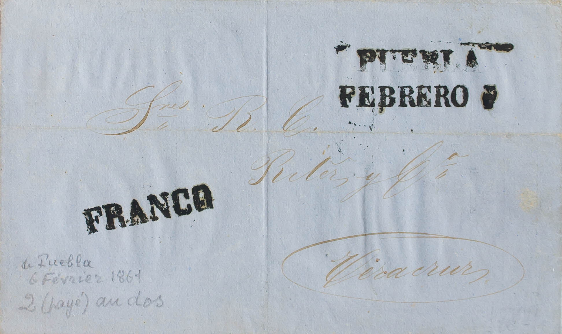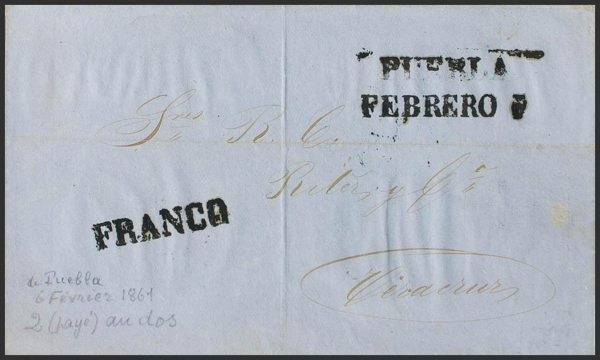 1861. PUEBLA to VERACRUZ. Marks PUEBLA / FEBRERO and FRANCO, both in black (Schatzkes 1147B and 1153), on the back portage "2". MAGNIFICENT.
