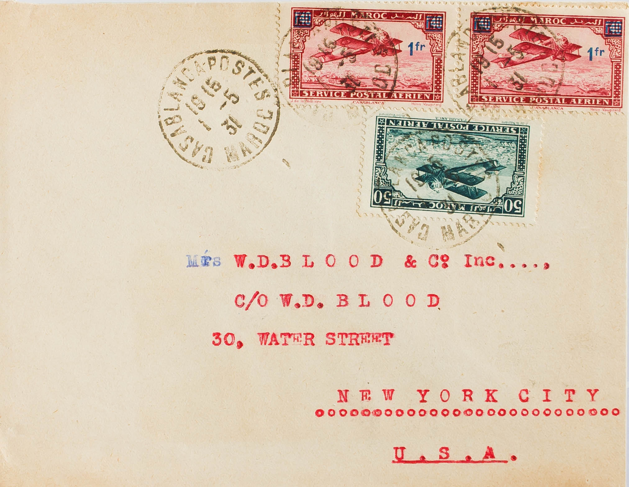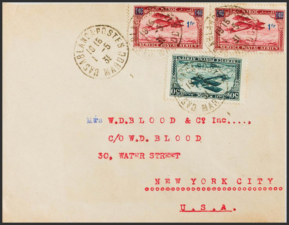 Yvert 3, 32(2). 1931. 50 cts blue green and 1 f over 1'40 fr chestnut red, two stamps. CASABLANCA to NEW YORK (USA). MAGNIFICENT.