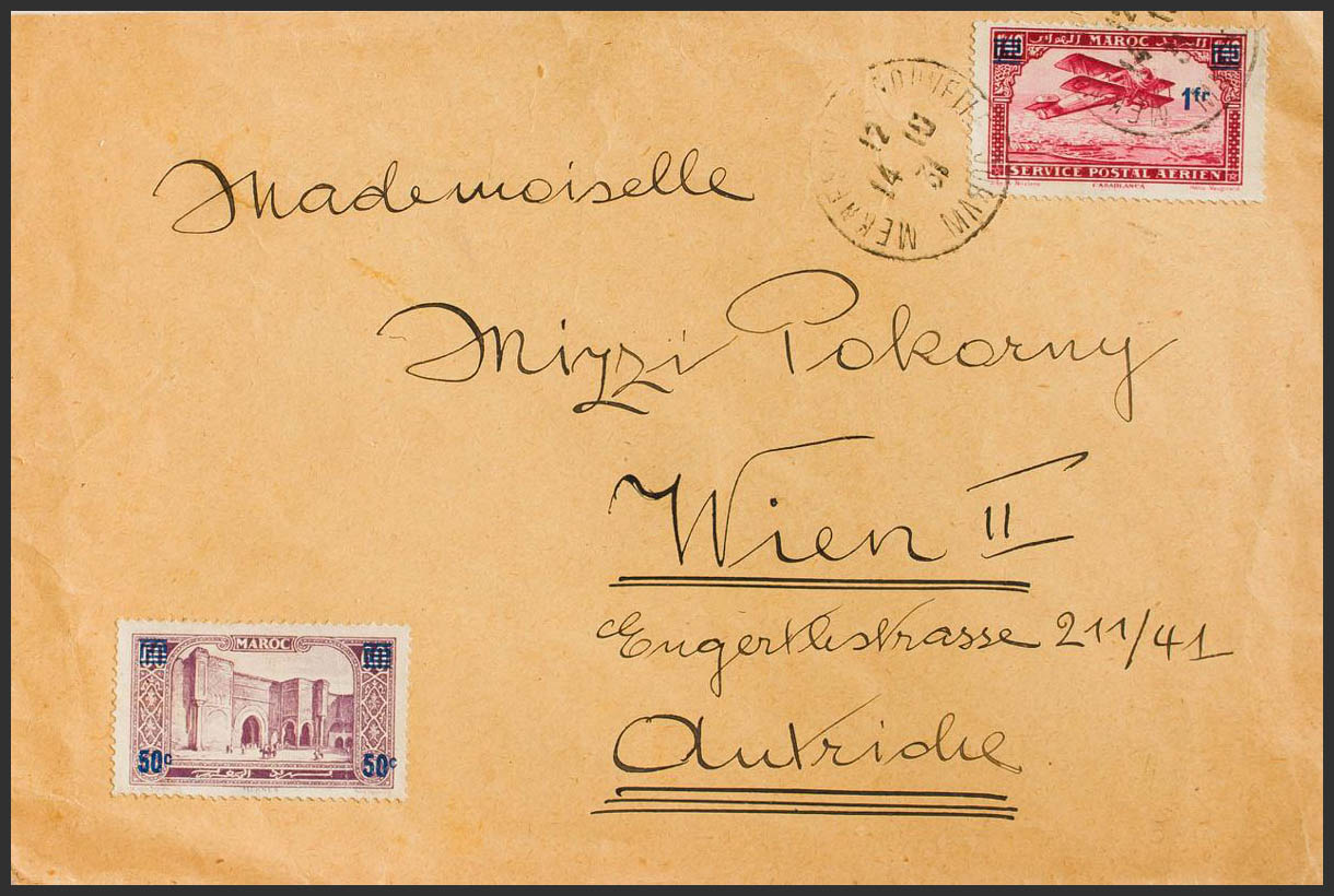 English Yvert 126, Aéreo 32. 1931. 50 cts on 60 lilac cts and 1 f on 1´40 f carmine red. MEKNES to VIENNA (AUSTRIA). MAGNIFICENT.
