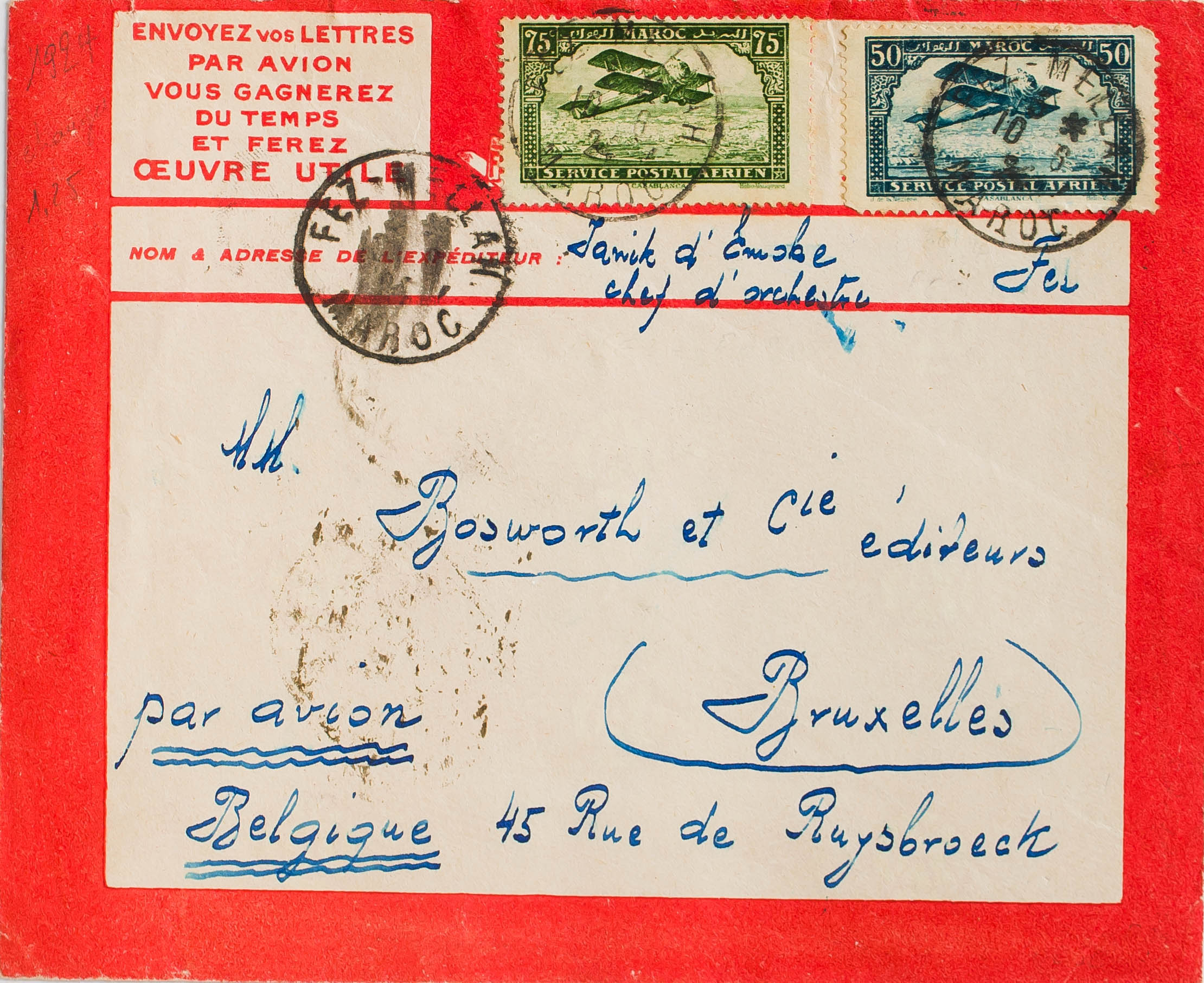 Yvert 3, 5. 1924. 50 cts blue green and 75 cts green. Cover from the Latecoere Company from FEZ to BRUSSELS (BELGIUM). On the back transit. MAGNIFICENT.