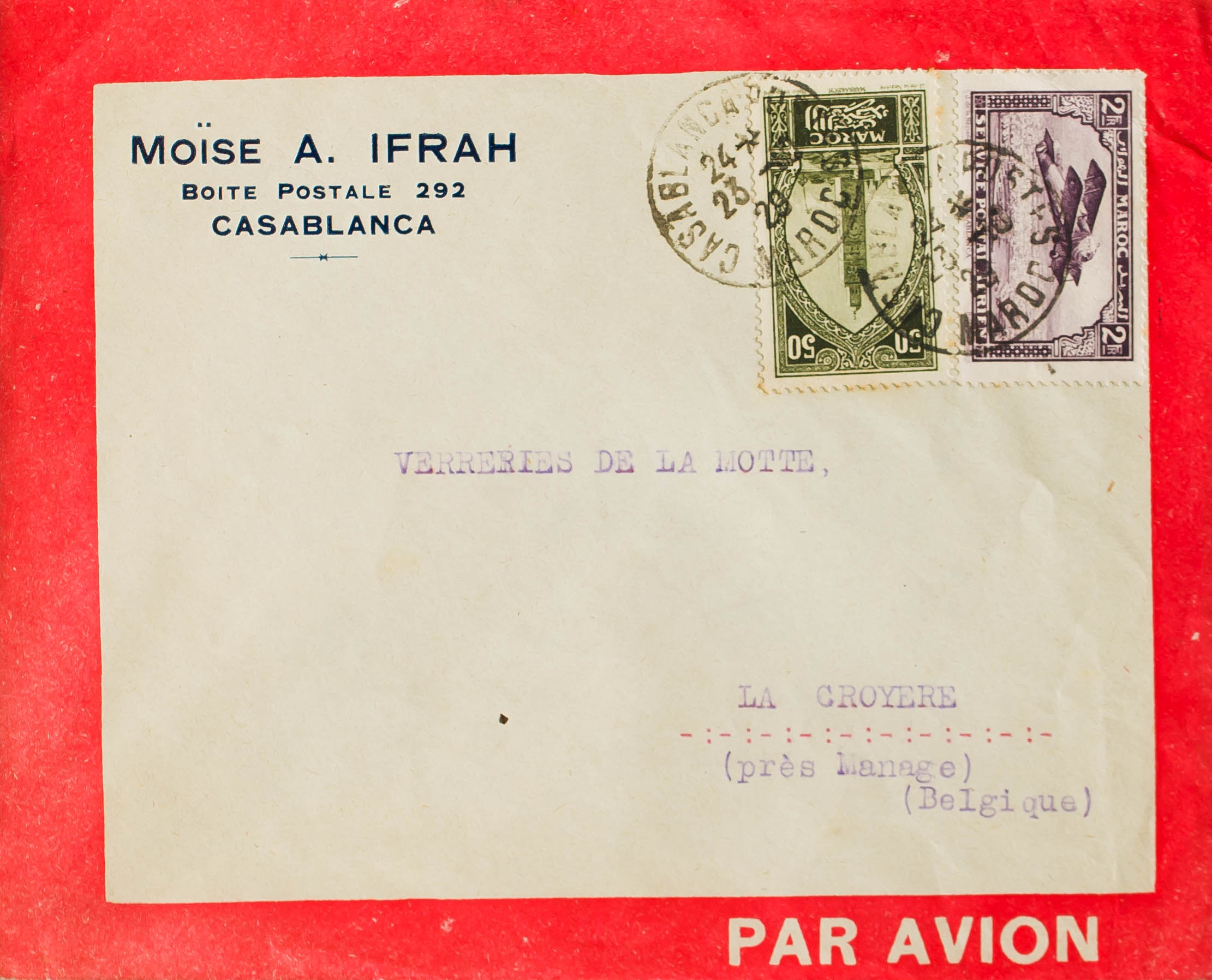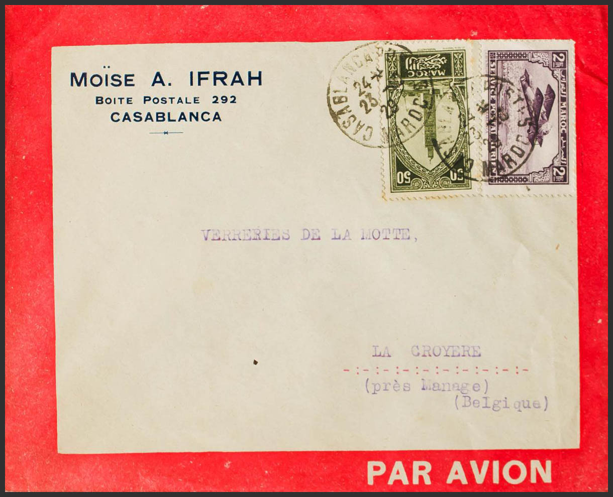 Yvert 113, Aerial 10. 1929. 50 cts green black and 2 fr violet. Cover from the Latecoere Company of CASABLANCA to LA CROYERE (BELGIUM). MAGNIFICENT.