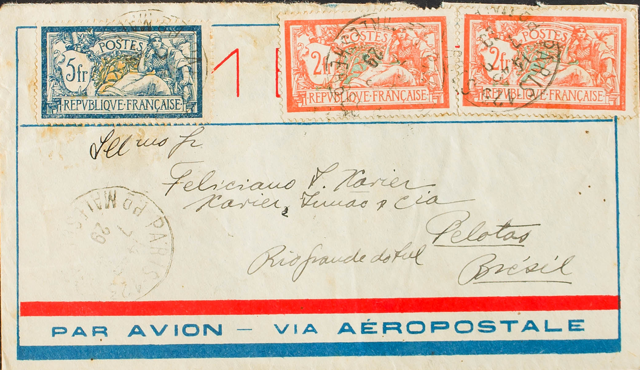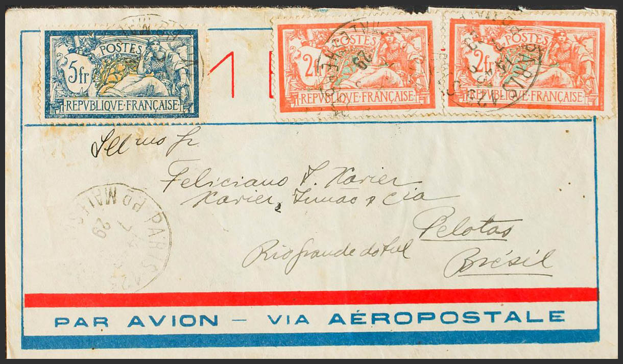 Yvert 123, 145(2). 1929. 5 fr blue and 2 fr orange, two stamps. PARIS to PELOTAS (BRAZIL). On the back arrival. MAGNIFICENT.