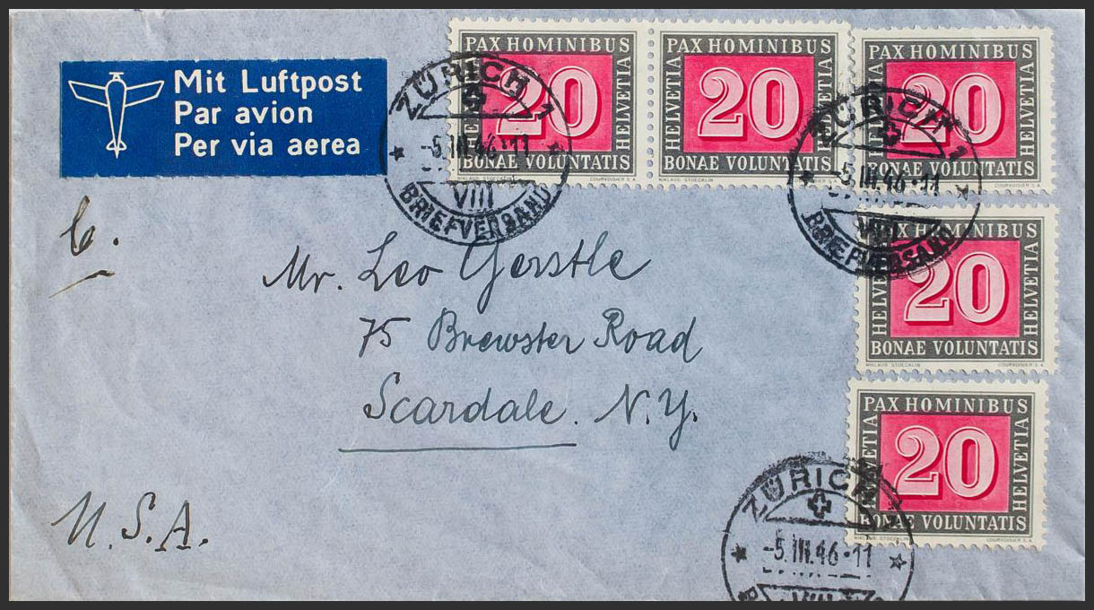English Yvert 407(5). 1946. 20 gray and lilac cts, five stamps. ZURICH to SCARDALE (USA). MAGNIFICENT.