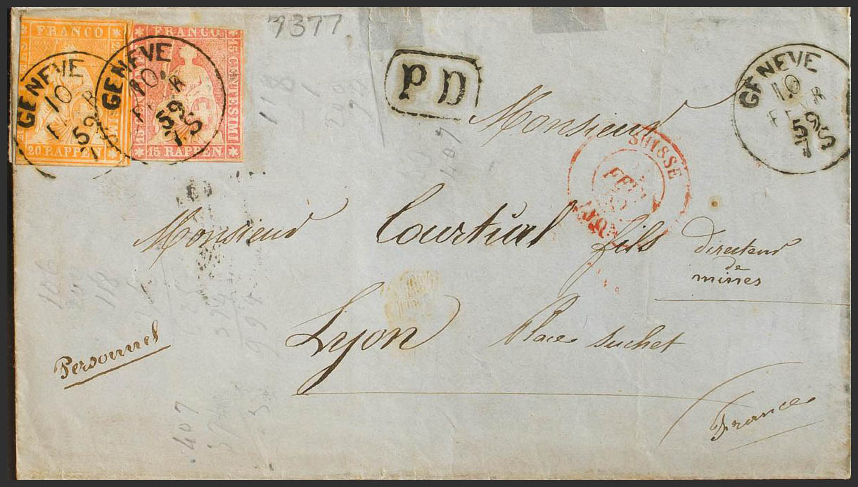 Yvert 28, 29. 1859. 15 r pink (short margin) and 20 r orange. GENEVA to LYON (FRANCE). Date postmark GENEVE. PRETTY.