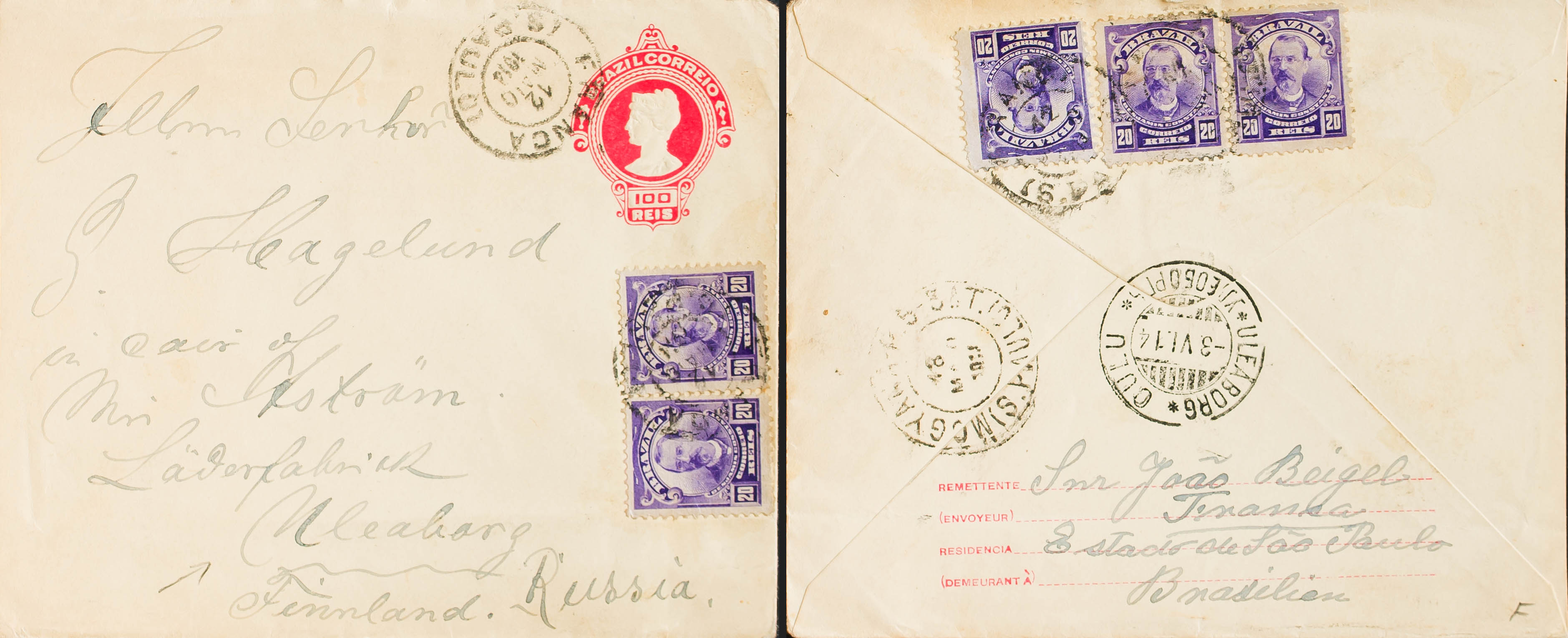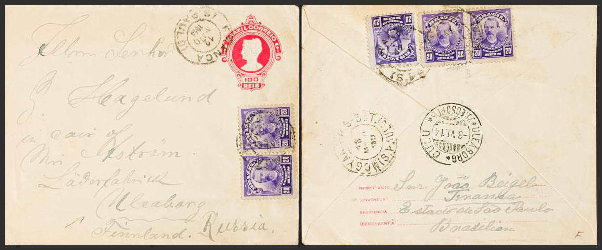 Yvert 129(5). 1914. 100 reis pink envelope Postal from SAO PAULO to ULEABORG (FINLAND), with additional postage of 20 r violet, five stamps (three of them on the back). On the back arrival. MAGNIFICENT AND VERY RARE DESTINATION.