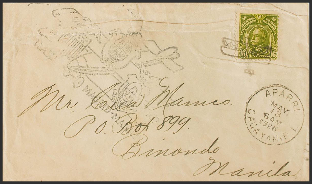 English Yvert 212. 1926. 16 cents olive. APARRI to MANILA. Postmark "Fancy" (airplane) and on the front mark RAID MADRID-MANILA, on the back mark MADRID TO MANILA FLIGHT / ACCOMPLISHED BY / SPANISH AVIATORS. MAGNIFICENT.
