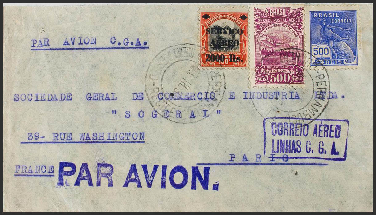 Yvert 205, Aerials 9 and 20. 1930. 500 reis overseas, 2000 reis on 100 red reis and 500 violet reis. PERNAMBUCO to PARIS (FRANCE). On the front CORREIO AEREO / LINHAS CGA brand, in purple. MAGNIFICENT.