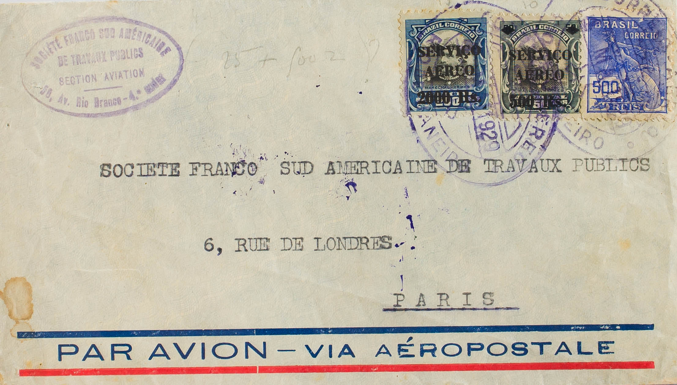 Yvert 205, Aerials 7 and 10. 1929. 500 reis overseas, 500 reis on 50 reis and 2000 reis on 200 reis. RIO DE JANEIRO to PARIS (FRANCE). AEROPOSTAL / RIO DE J. date stamp on the back, in violet. MAGNIFICENT.