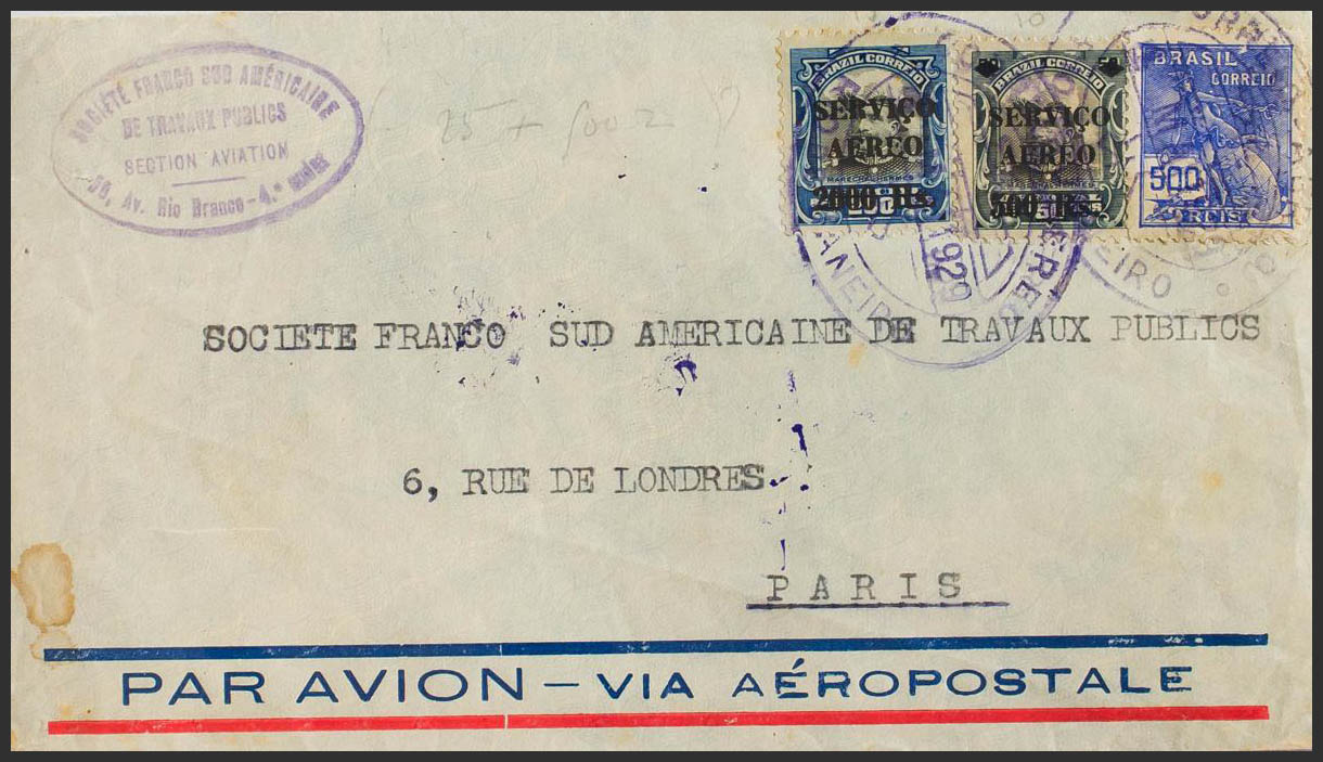 English Yvert 205, Aerials 7 and 10. 1929. 500 reis overseas, 500 reis on 50 reis and 2000 reis on 200 reis. RIO DE JANEIRO to PARIS (FRANCE). AEROPOSTAL / RIO DE J. date stamp on the back, in violet. MAGNIFICENT.