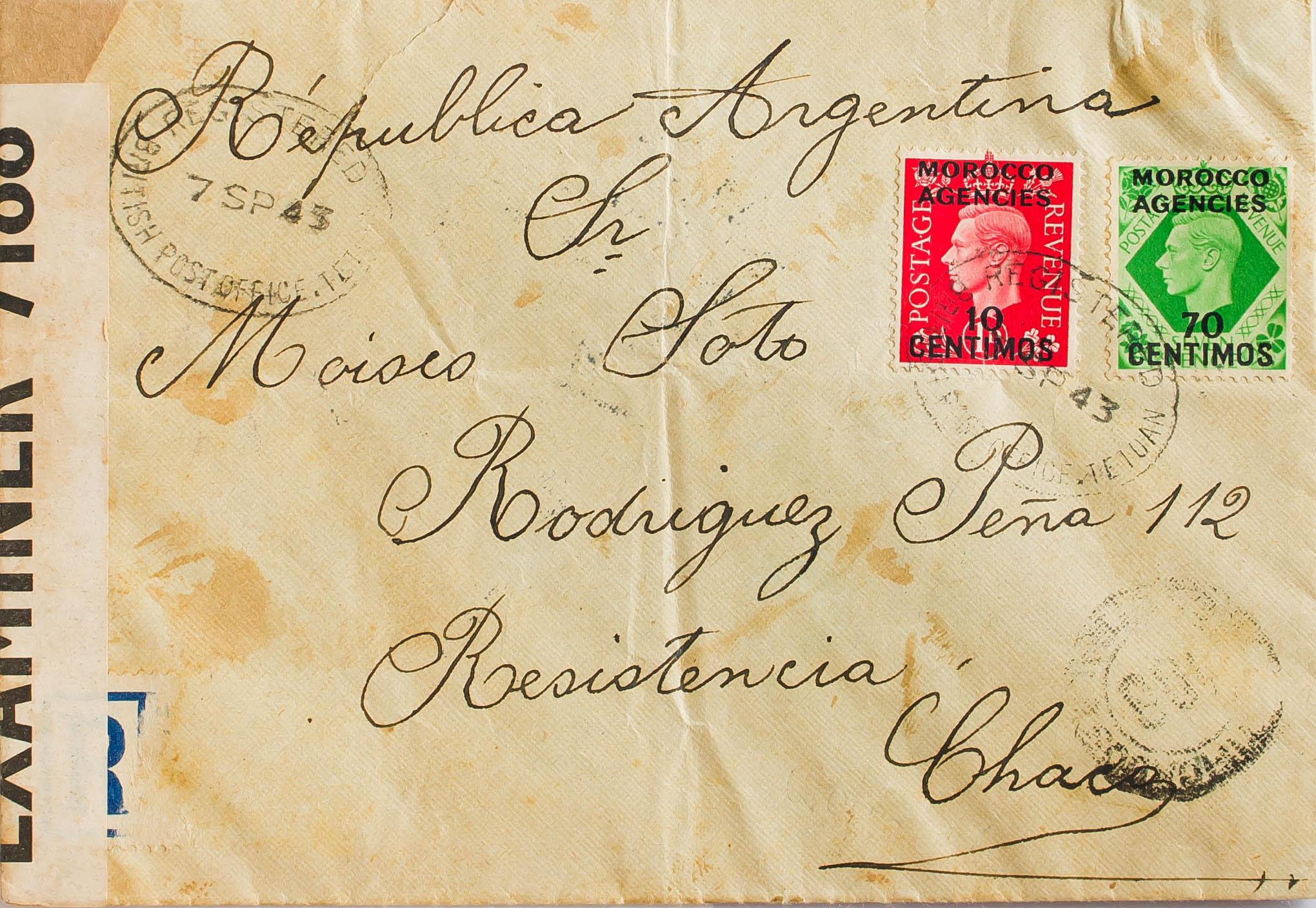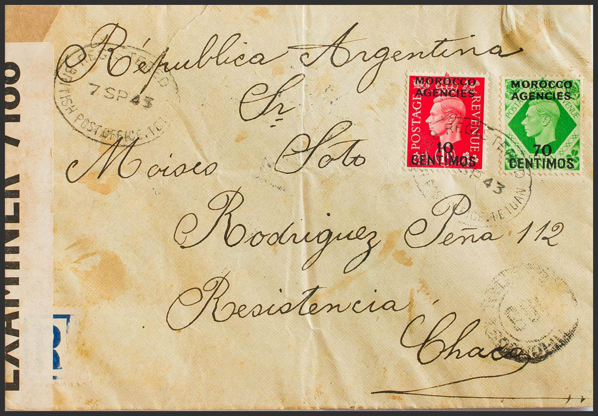Yvert 72, 76. 1943. 10 cts over 1 p pink and 70 cts over 7 p green. Certificate from TETUAN to RESISTENCIA (ARGENTINA), circulated via Gibraltar and Lisbon. On the arrival front. MAGNIFICENT AND RARE.