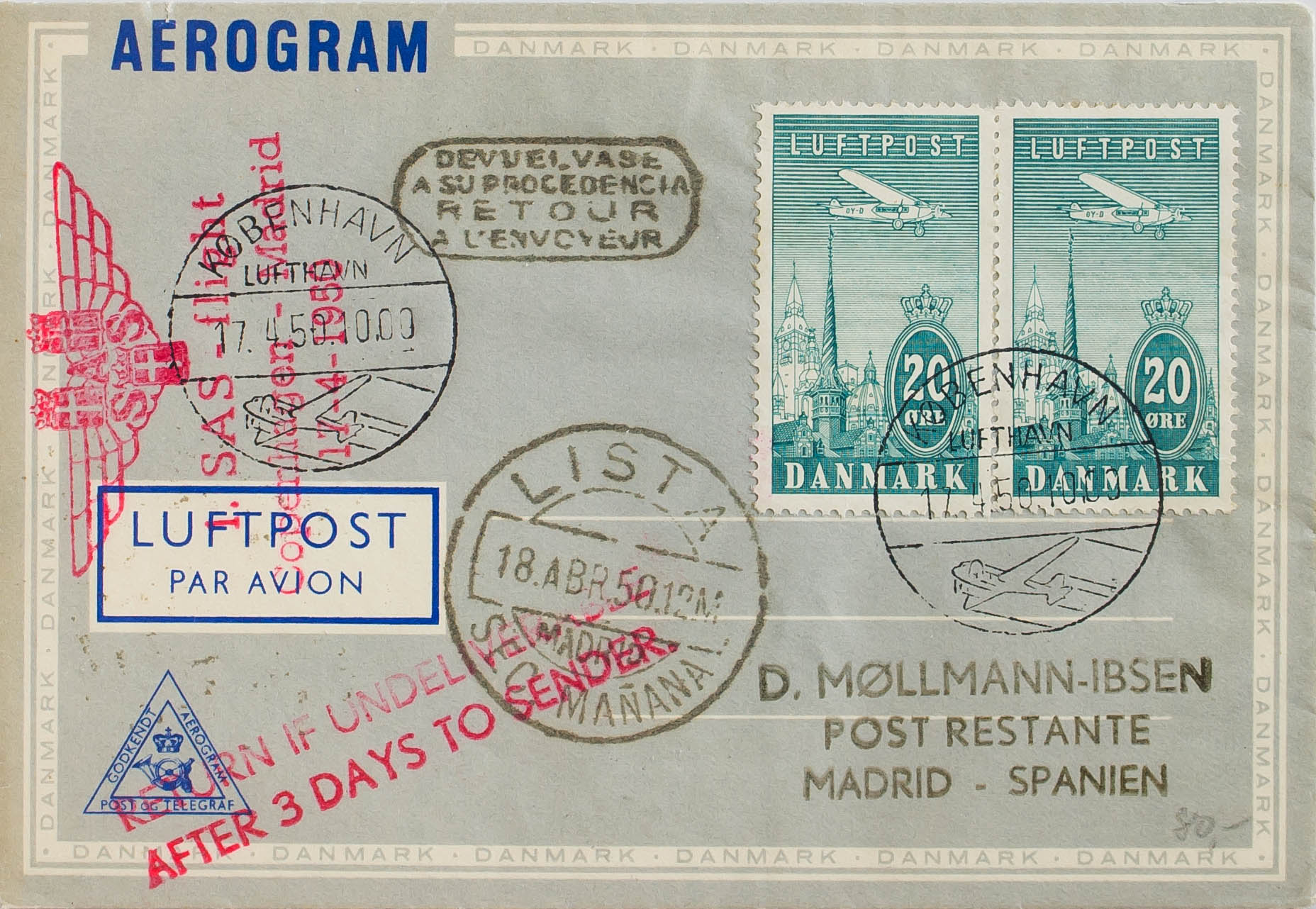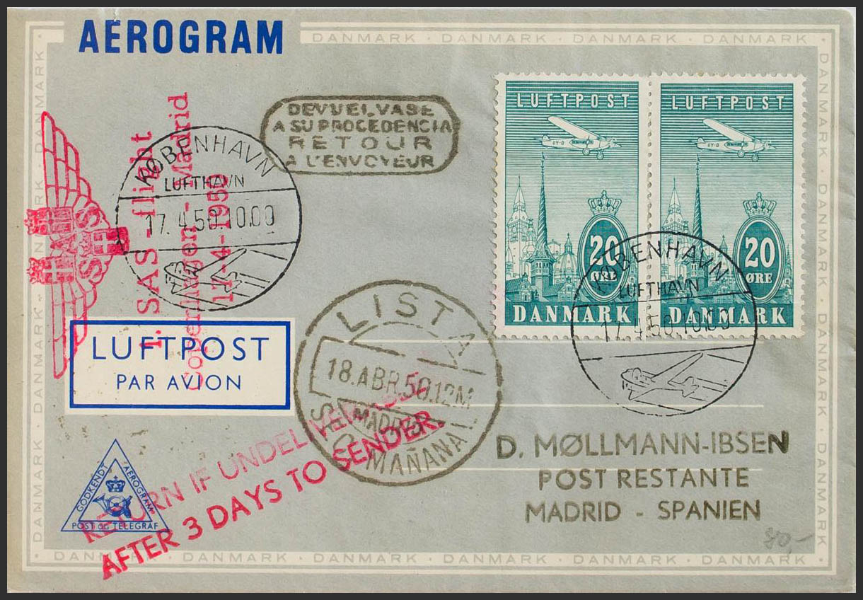 Yvert 8(2). 1950. 20 ore green grey, two stamps. Airgram from COPENHAGEN to MADRID. On the front it marks 1. SAAS-FLIGHT / COPENHAGEN-MADRID, in red and various returns marks. MAGNIFICENT AND RARE.