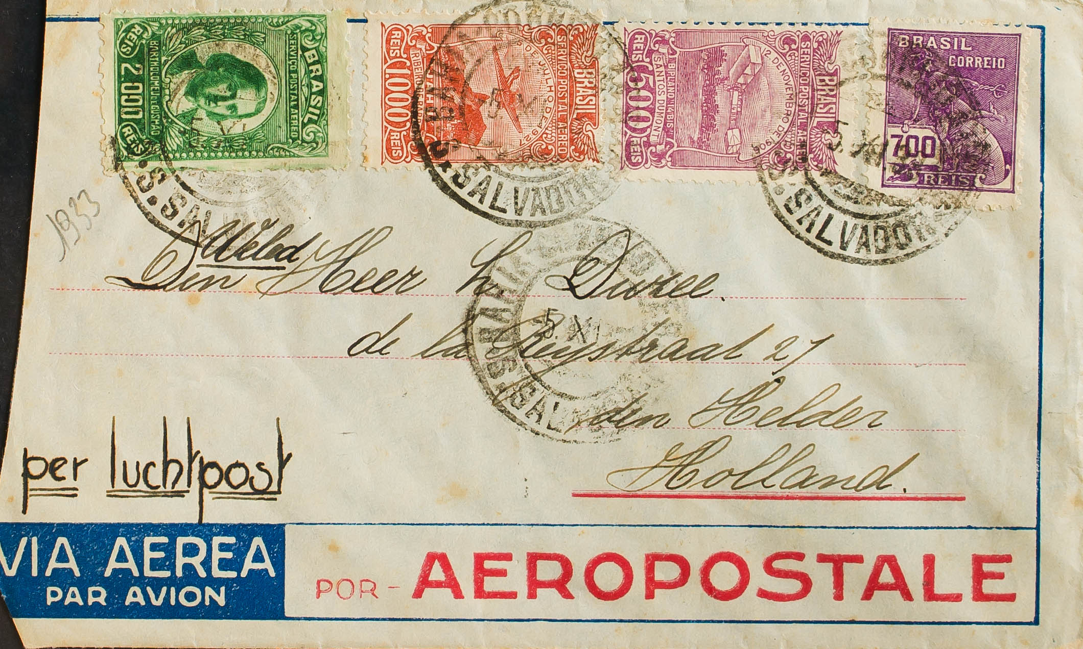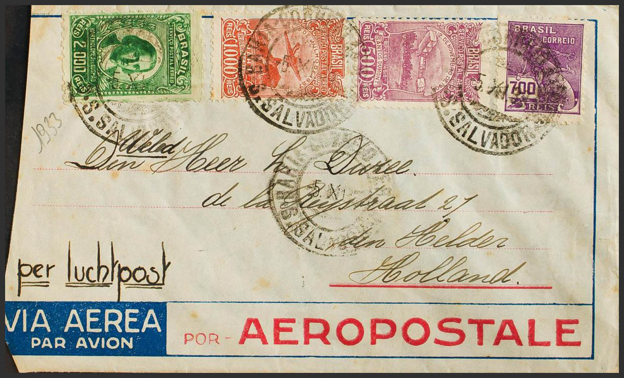 Yvert 207, Aerials 20/22. 1933. 700 violet reis, 500 violet reis, 1000 chestnut red reis and 2000 green reis. SALVADOR DE BAHIA to DEN HELDER (HOLLAND). VIA AIR FRANCE and transit PARIS mark on the back. MAGNIFICENT.