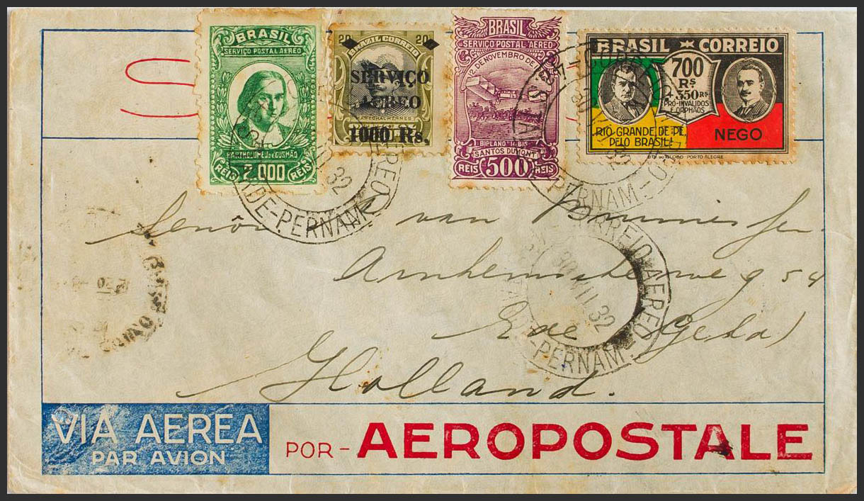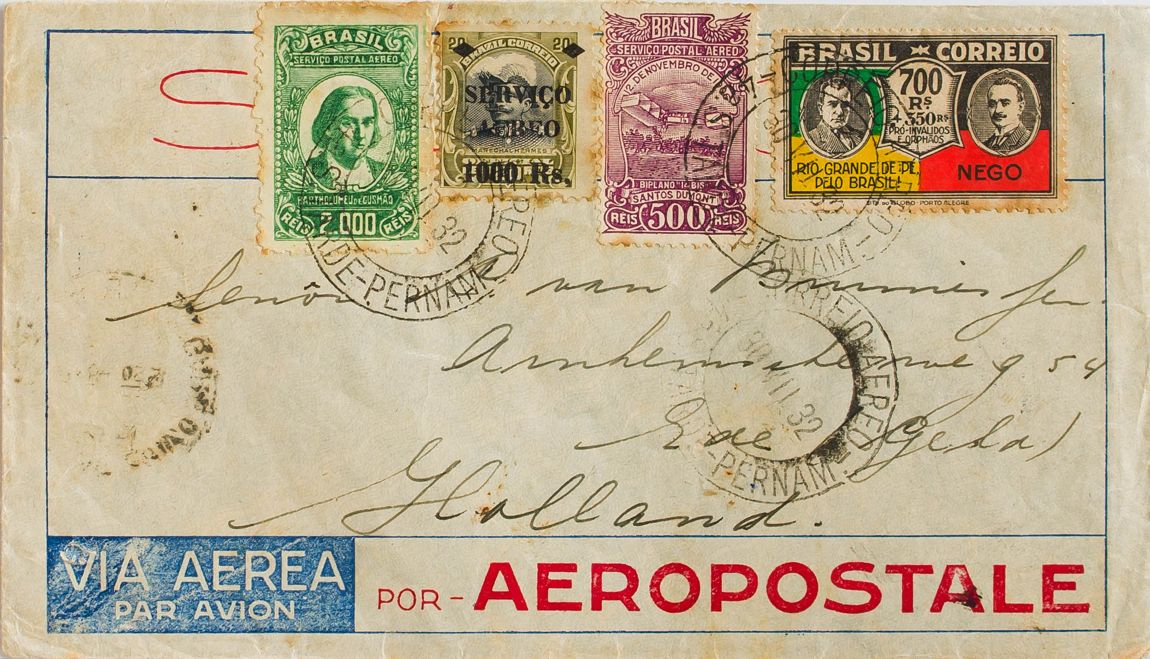 English Yvert 230, Aéreos 8, 20, 22. 1932. 700 multicolored reis, 1000 reis on 20 reis, 500 violet reis and 2000 green reis (some shaded value). PERNAMBUCO to NETHERLANDS. On the back transits PARIS and ROTTERDAM. PRETTY.