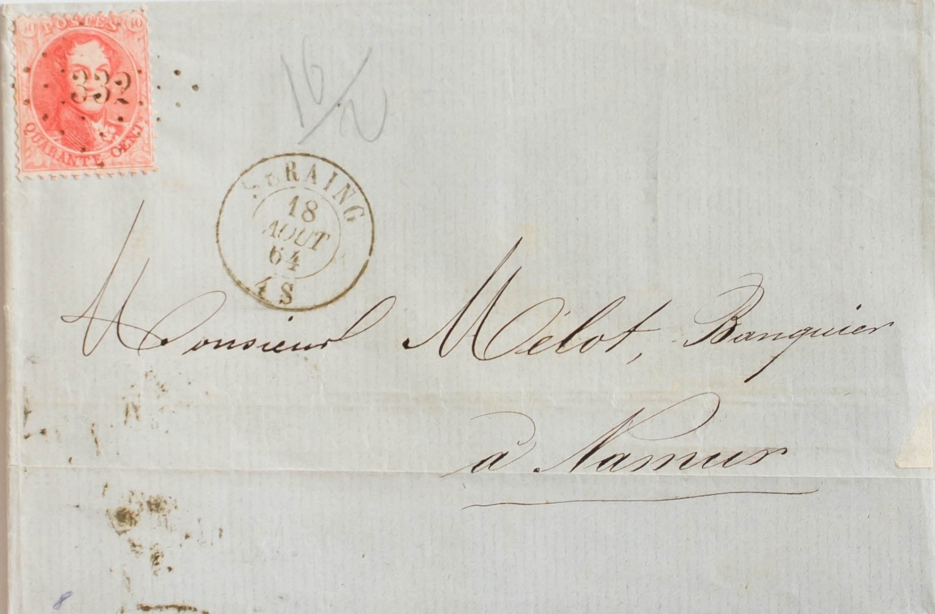 Yvert 16A. 1864. 40 cts red DENTATED 12 ½. SERAING to NAMUR. RHOMBUS OF DOTS postmark Nº332. MAGNIFICENT.