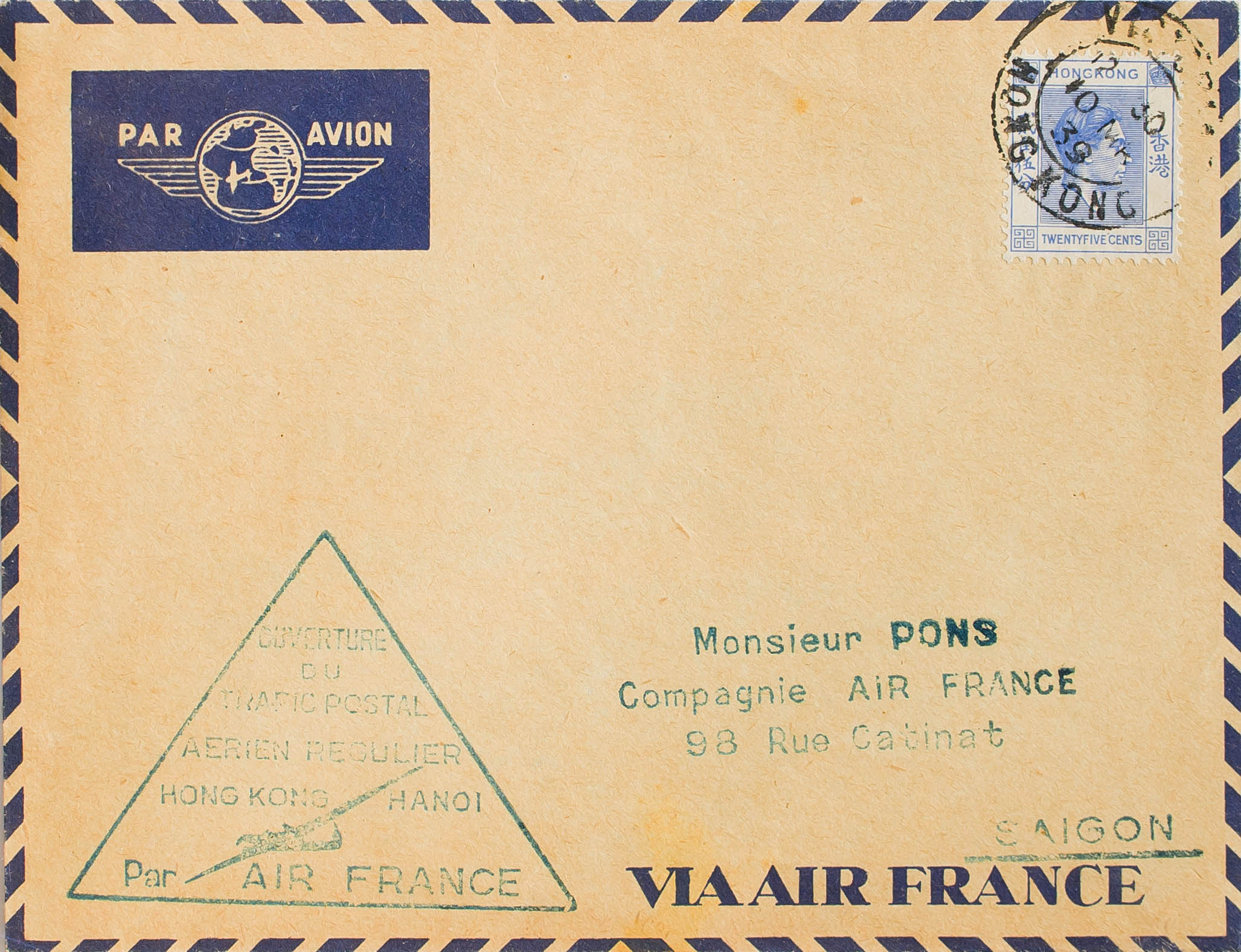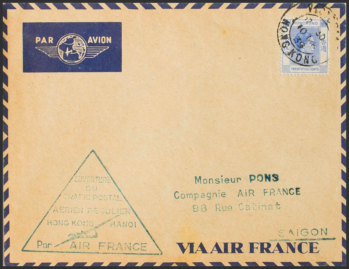 Yvert 148. 1939. 25 cts overseas. HONGKONG to SAIGON. On the front it marks OUVERTURE / DU / TRAFIC POSTAL / AERIEN REGULIER / HONG-KONG HANOI / PAR AIR FRANCE, in blue and arrival on the back. MAGNIFICENT.