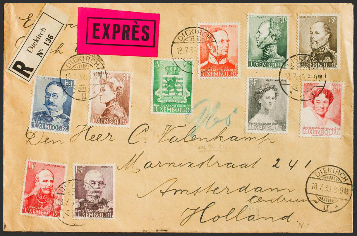 Yvert 312/21. 1939. Complete series. Certificate from DIEKIRCH to AMSTERDAM (HOLLAND). On the back arrival. MAGNIFICENT.