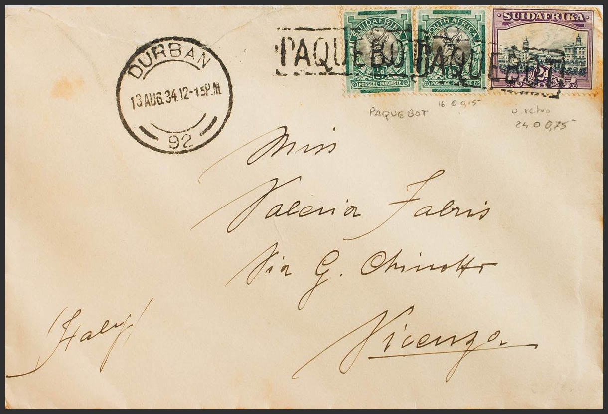Yvert 38, 47, 49. 1934. ½ p green and black, two stamps with different legends and 2 p violet and gray (toned). DURBAN to VICENZA (ITALY). PAQUEBOT maritime postmark. PRETTY.