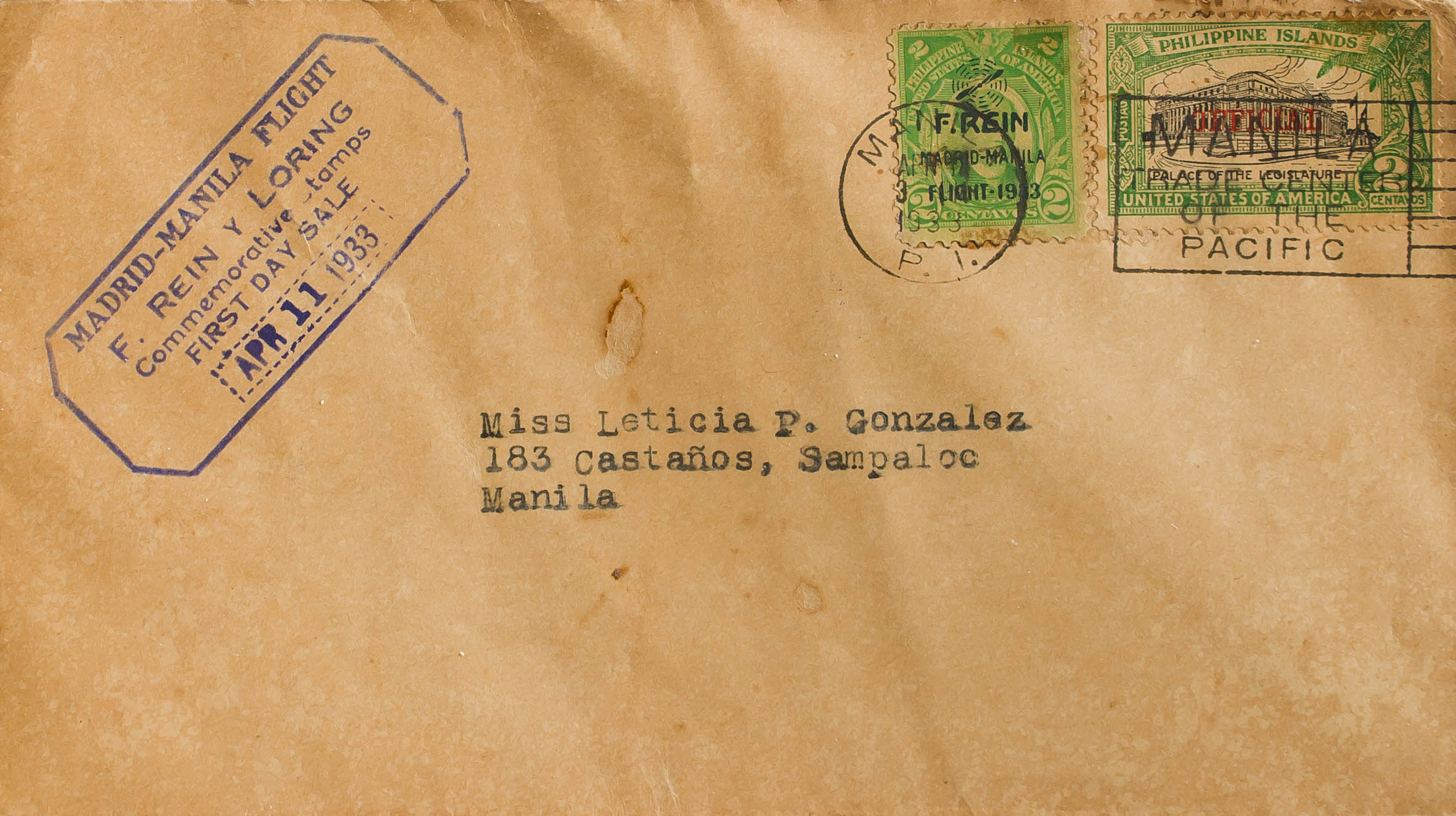 Yvert 227, Air 31A. 1933. 2 cents green and black and 2 cents green (toned). First Day Cover. On the front mark MADRID-MANILA FLIGHT / F. REIN Y LORING, in violet. PRETTY.