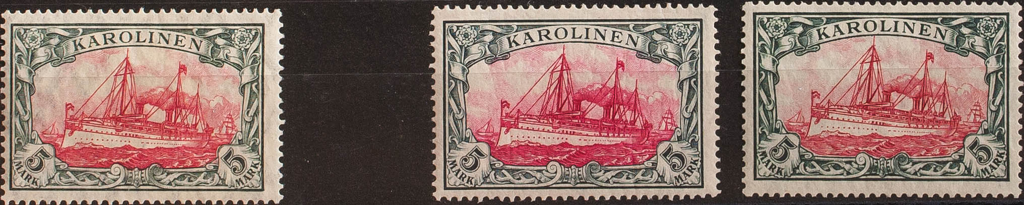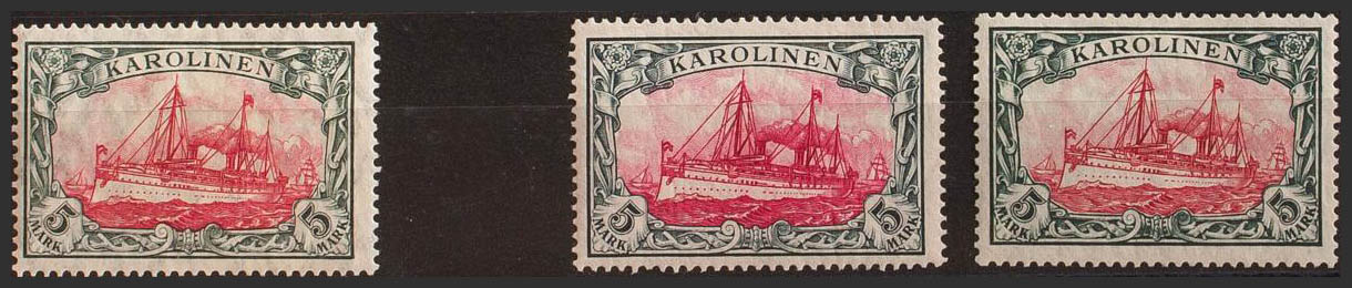 ★Yvert 23(3). 1914. 5 m green black and carmine (Friedensdruck 26:17), 5 m green black and carmine (Kriegsdruck 26:17), and 5 m green black and carmine (Kriegsdruck 25:17). MAGNIFICENT. (Mi22IA, 22IIA, 22IIB 335 Euros)