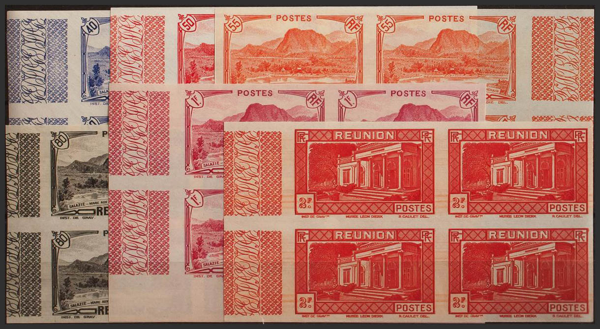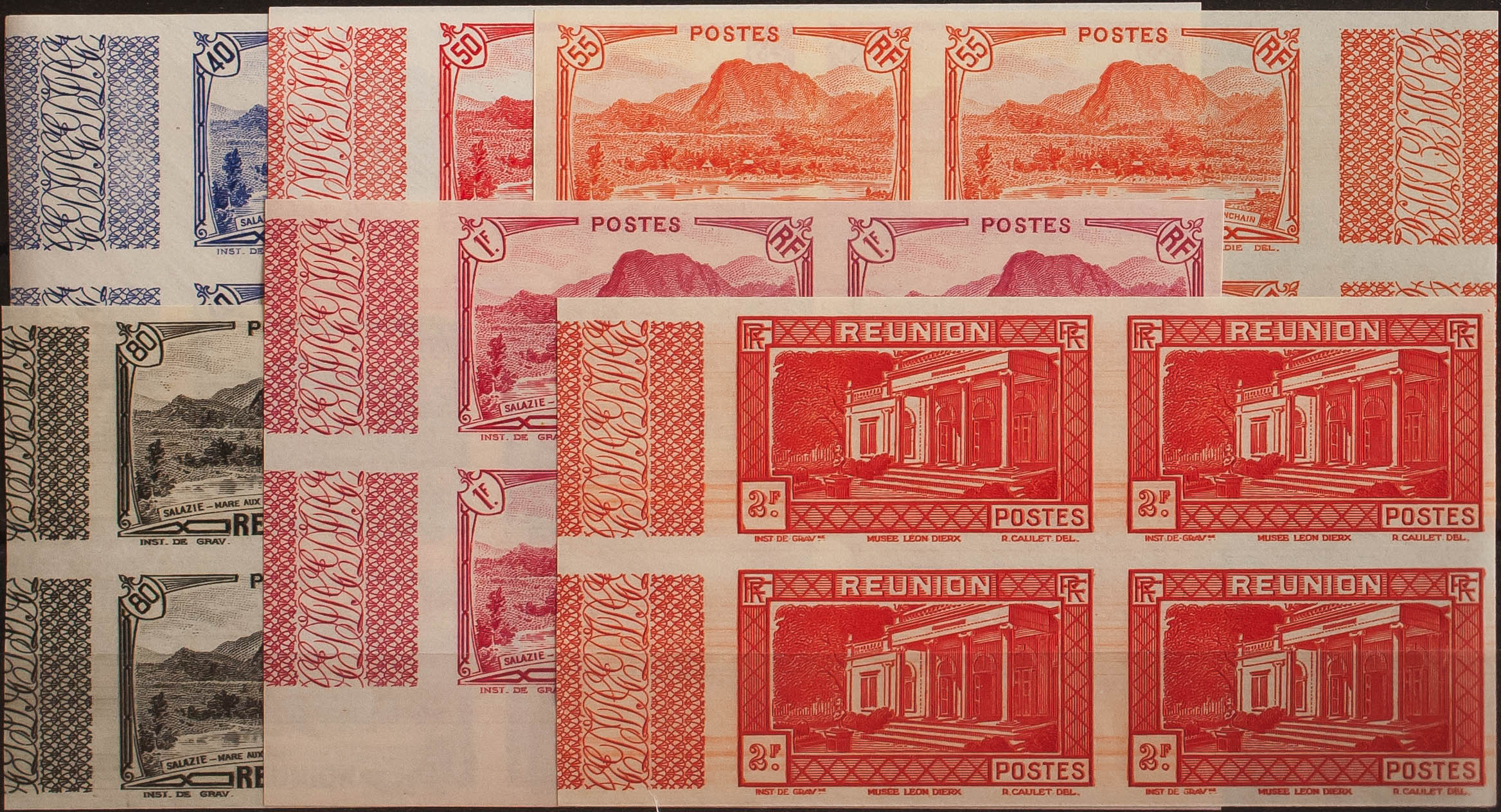 ★★Yvert 134a, 136a, 136Aa, 138Aa,140Aa. 1933. 40 cts ultramarine, 50 cts red, 55 cts orange, 80 cts black, 1 f red and 2 f orange, blocks of four. NO TEETH. MAGNIFICENT. Yvert 2013: 2,180 Euros