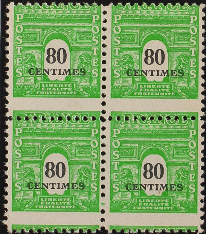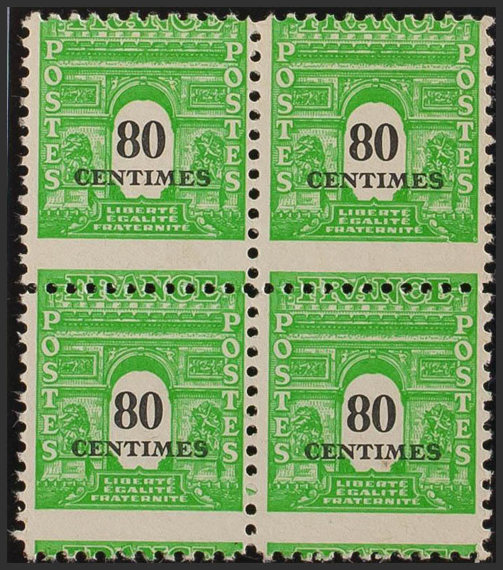 ★★Yvert 706(2). 1945. 80 green cts, block of four. DISPLACED HORIZONTAL TEETH. MAGNIFICENT. (Maury 2016: 706c, 200 Euros)