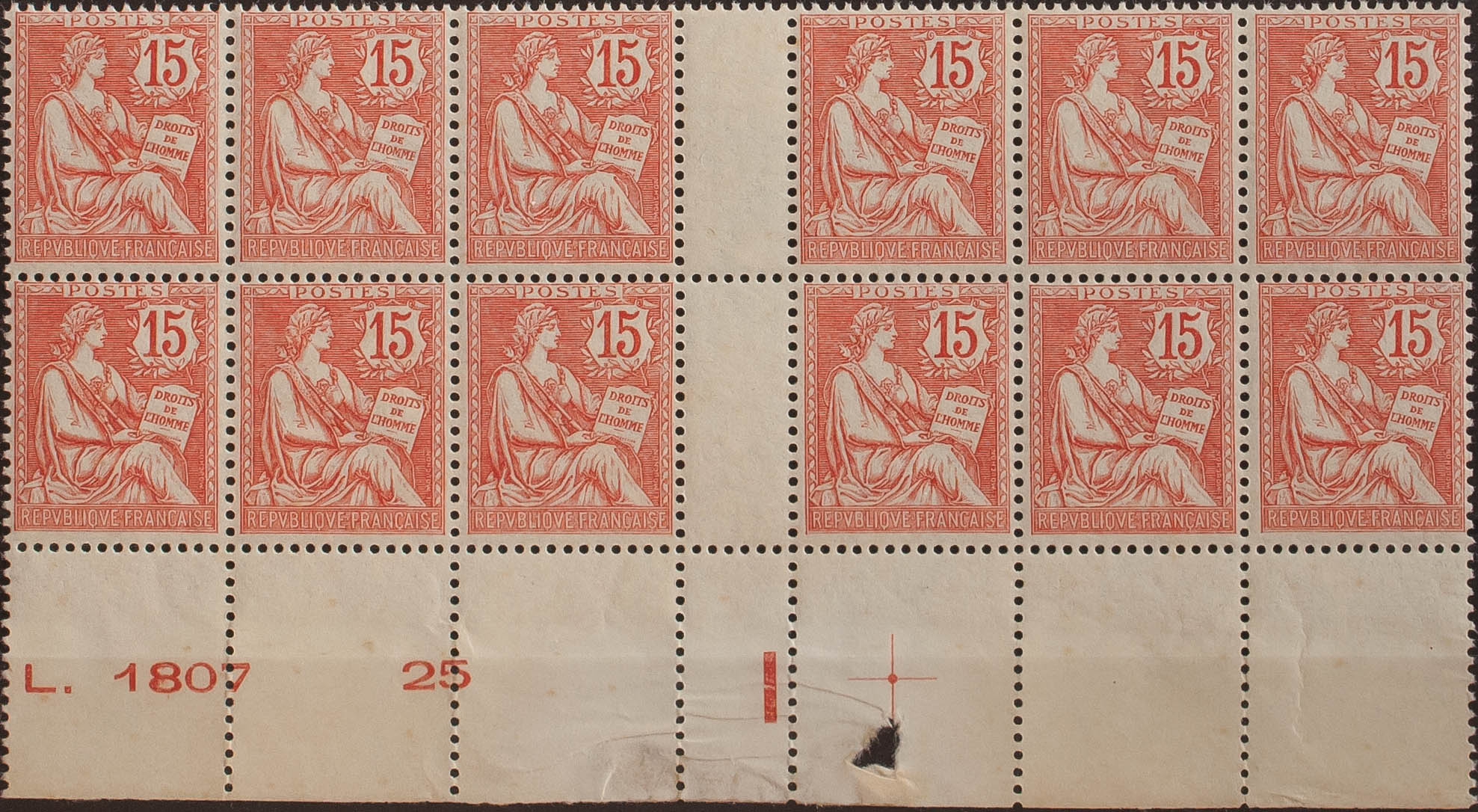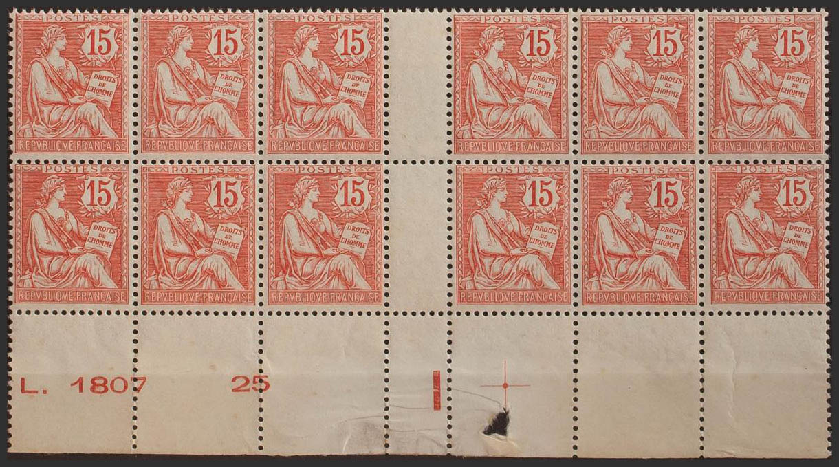 ★★Yvert 125(12). 1902. 15 vermilion cts, block of twelve withINTERPANEL. MAGNIFICENT AND RARE. Yvert 2014: +++720 Euros