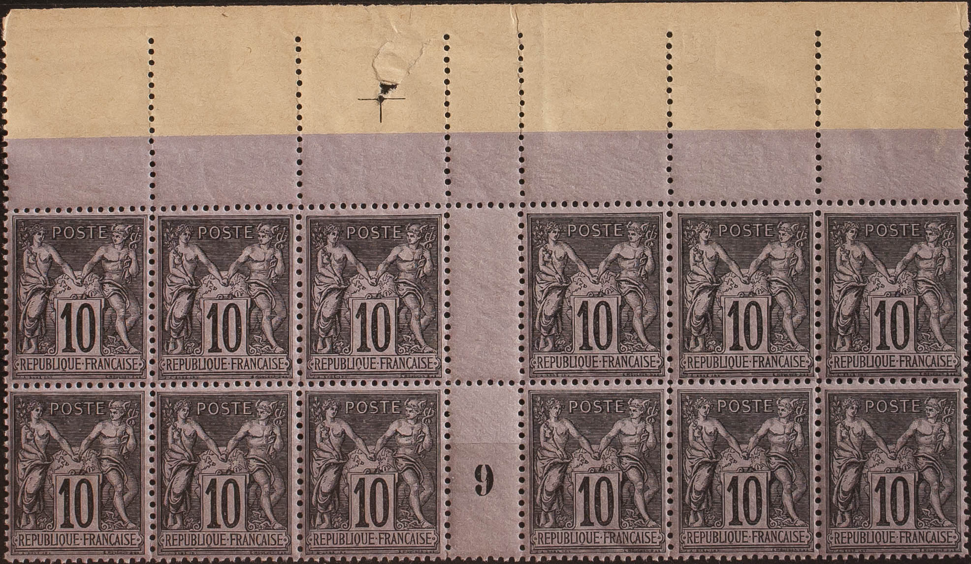 ★★Yvert 103(12). 1898. 10 cts black on lilac, block of twelve with INTERPANEL (one with figure 9). Excellent centers. MAGNIFICENT AND RARE. Yvert 2014: +++540 Euros