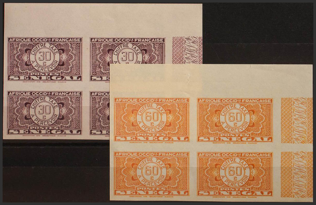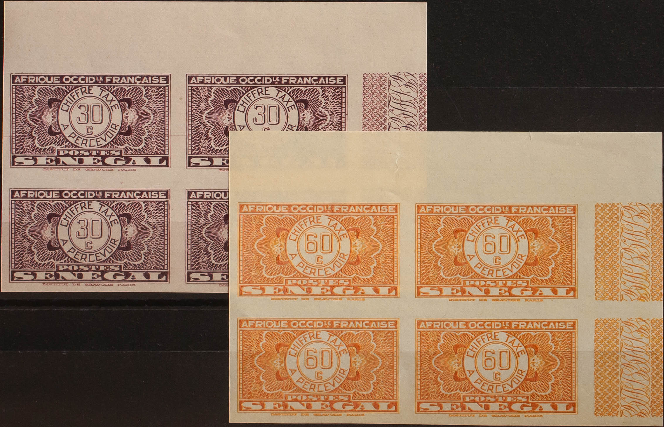 English ★★Yvert 26(4), 28(4). 1935. 30 cts purple and 60 cts orange, blocks of four, sheet corner. NO TEETH. MAGNIFICENT. Yvert 2013: 168 Euros
