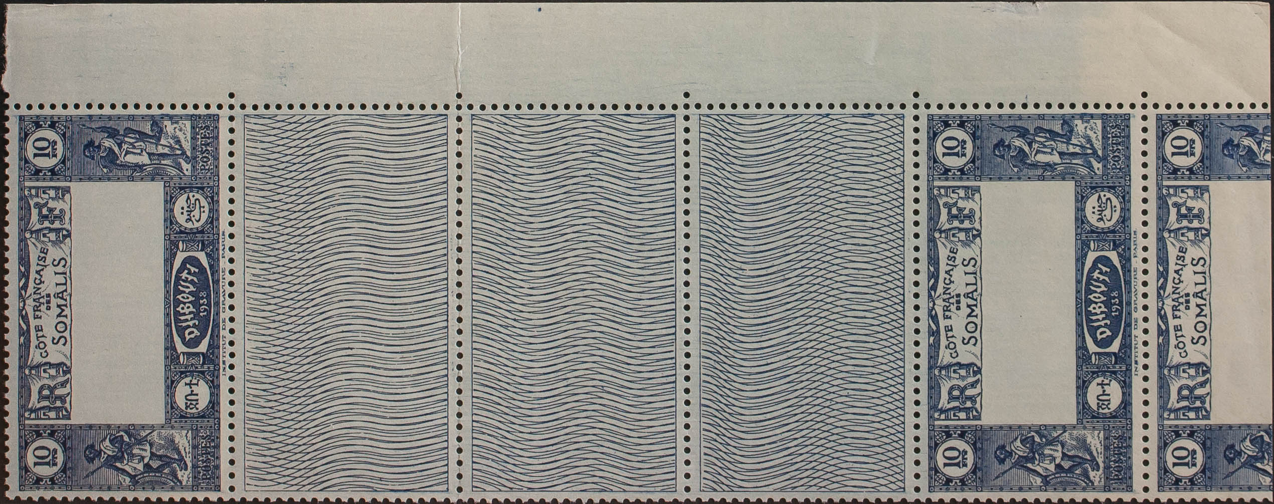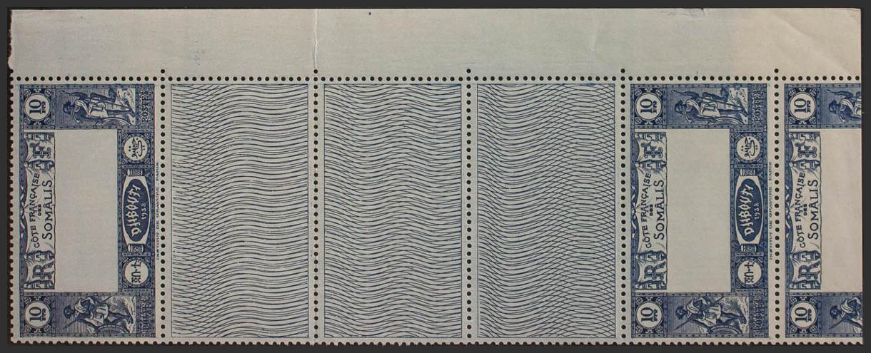 ★★Yvert 168a(2). 1938. 10 f blue, pair with triple interpanel (and part of another stamp). OMITTED CENTER. MAGNIFICENT AND RARE. Yvert 2013: +++1,000 Euros