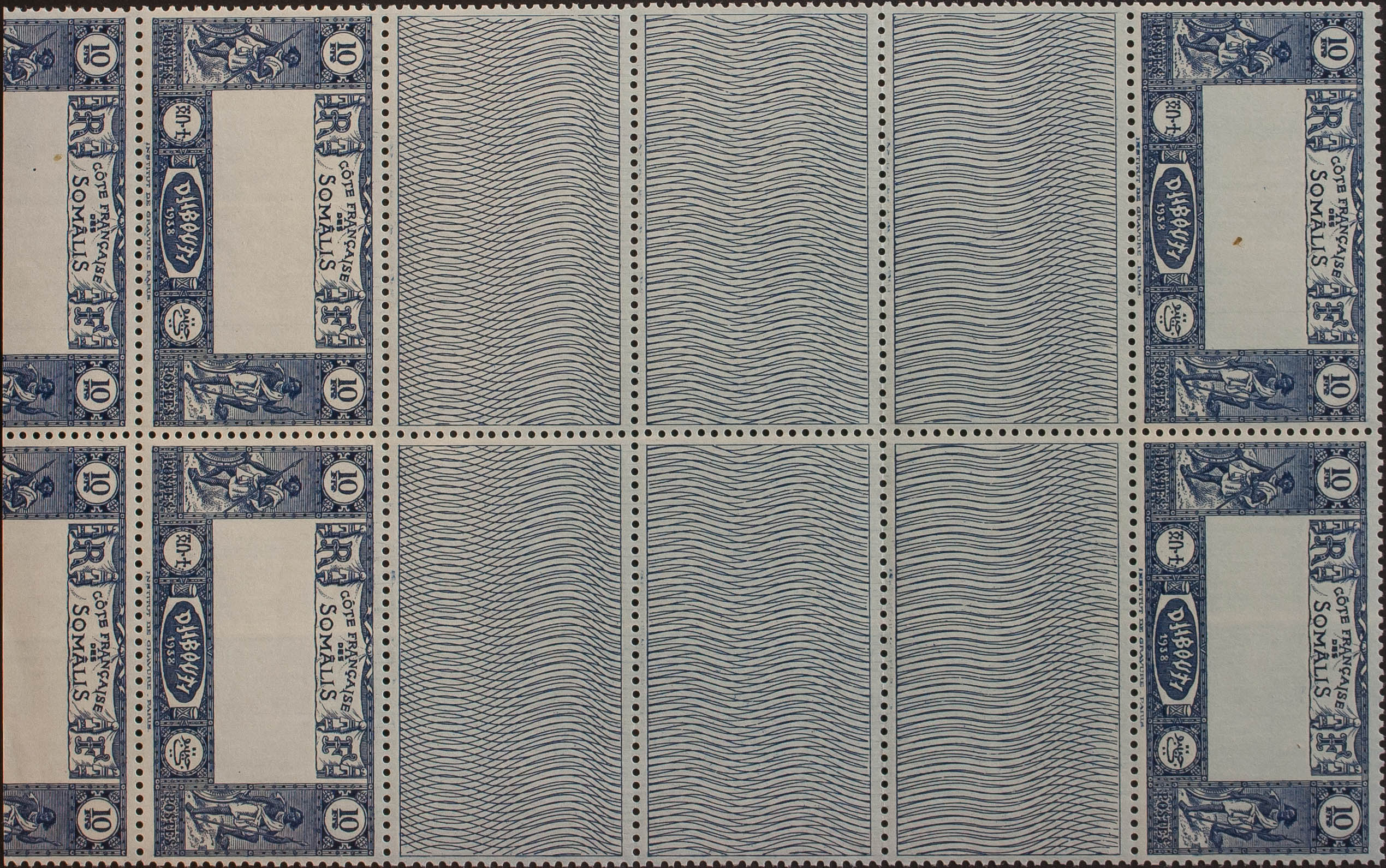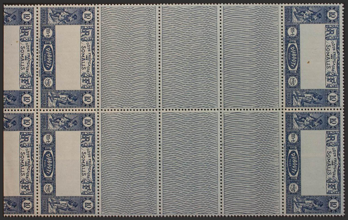 English ★★Yvert 168a(4). 1938. 10 f blue, block of four with triple interpanel (and part of another stamp). OMITTED CENTER. MAGNIFICENT AND RARE. Yvert 2013: +++2,000 Euros