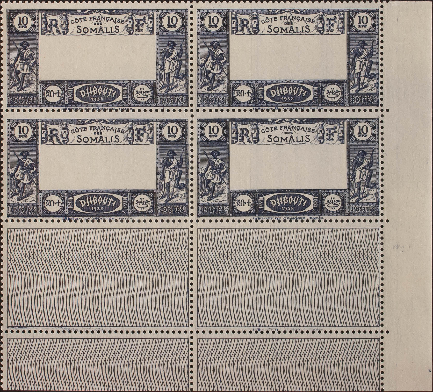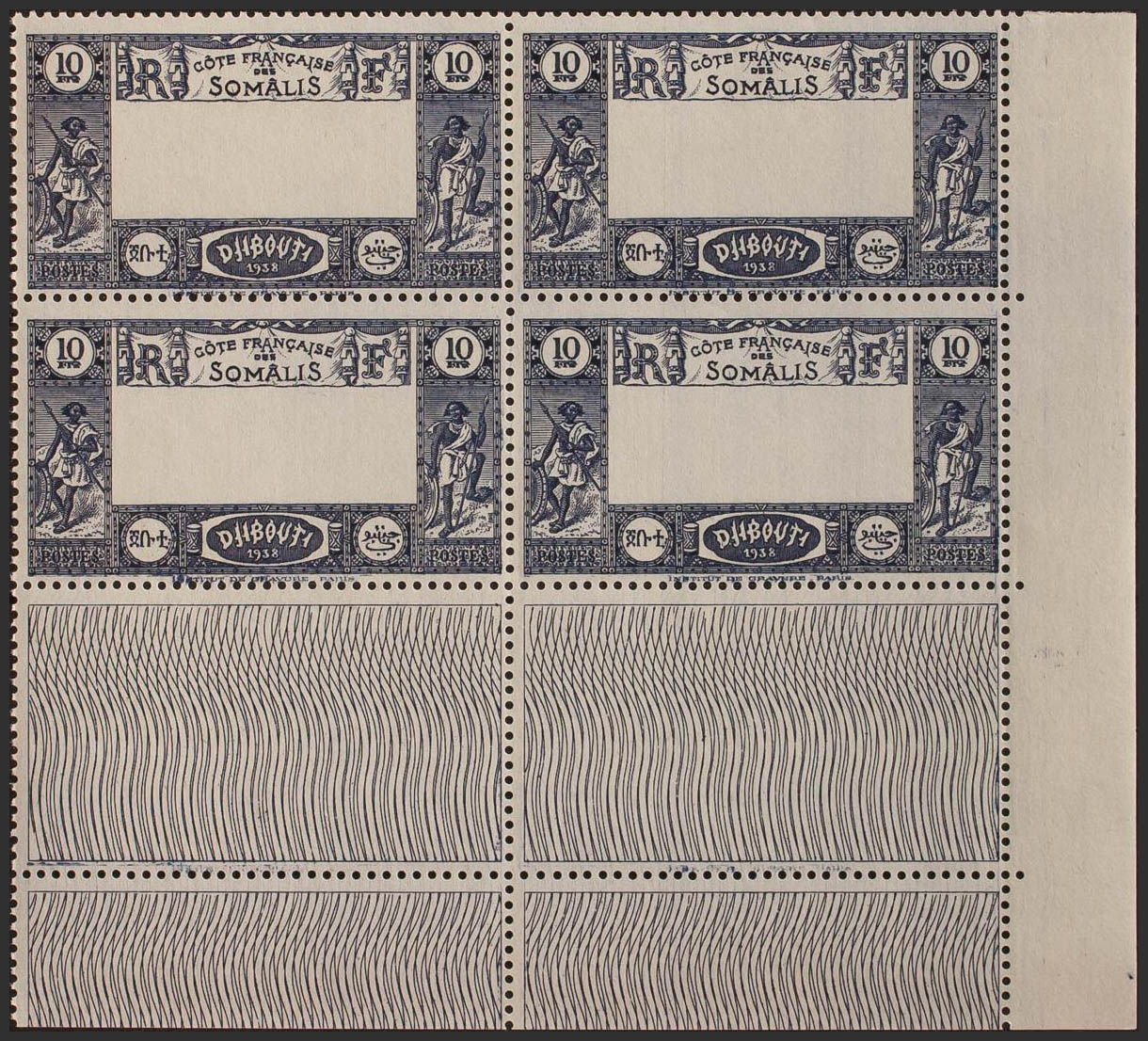 English ★★Yvert 168a(4). 1938. 10 f blue, block of four, sheet corner. CENTER VARIETY OMITTED. MAGNIFICENT AND RARE. Yvert 2013: +2,000 Euros