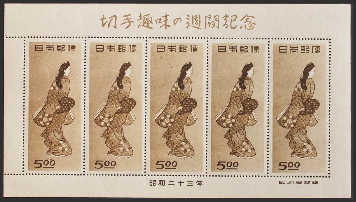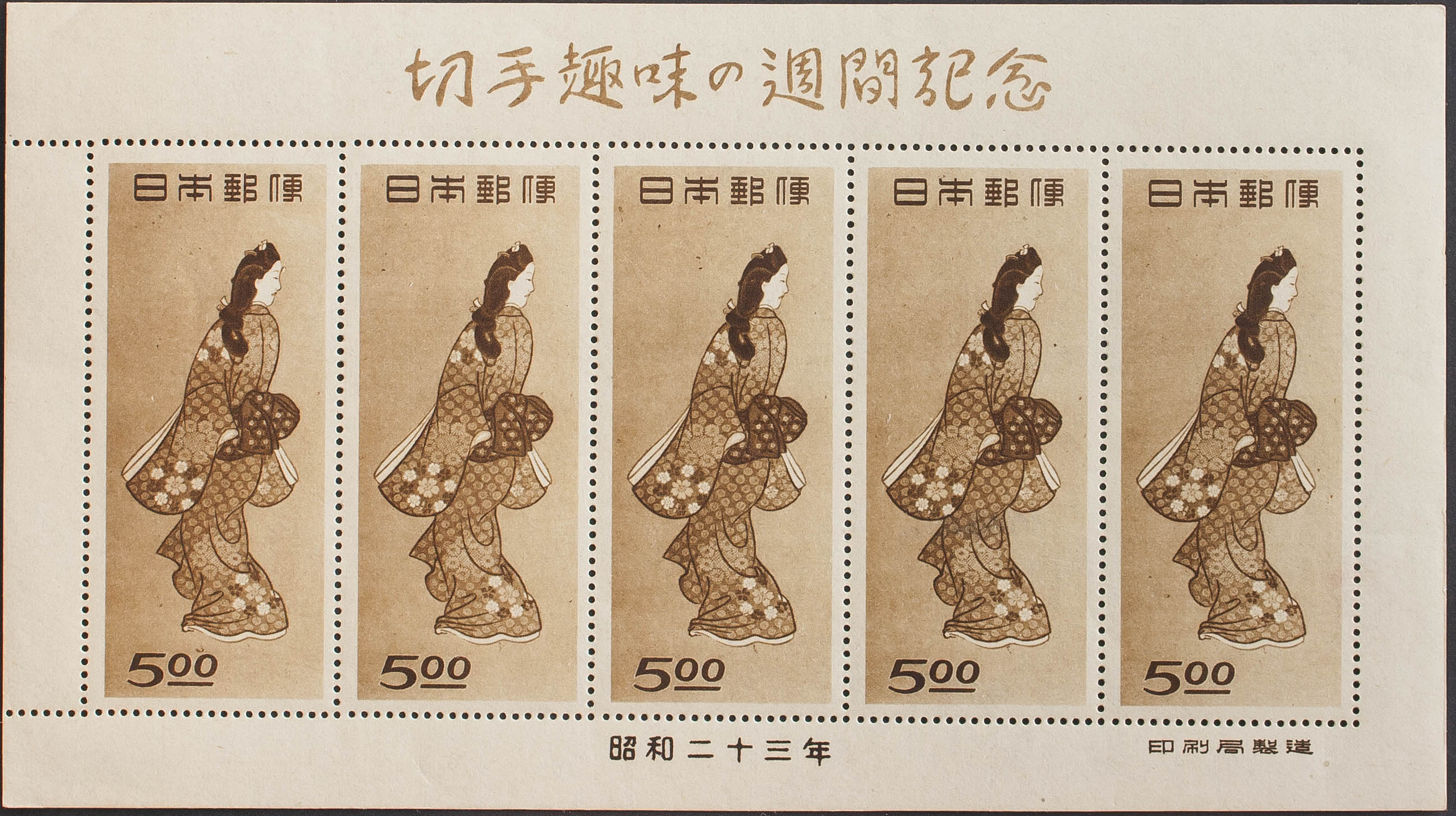 ★★Yvert 403(5). 1948. 5 and brown, mini sheet of five stamps (one stamp with a grease stain), four perfect stamps. PRETTY. Edifil 2015: 550 Euros