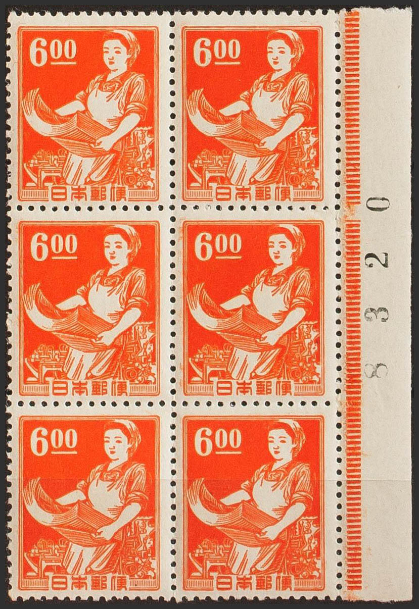 ★★Yvert 396(6). 1948. 6 and orange, block of six, sheet edge, with plate number. MAGNIFICENT. Yvert 2015: +72 Euros