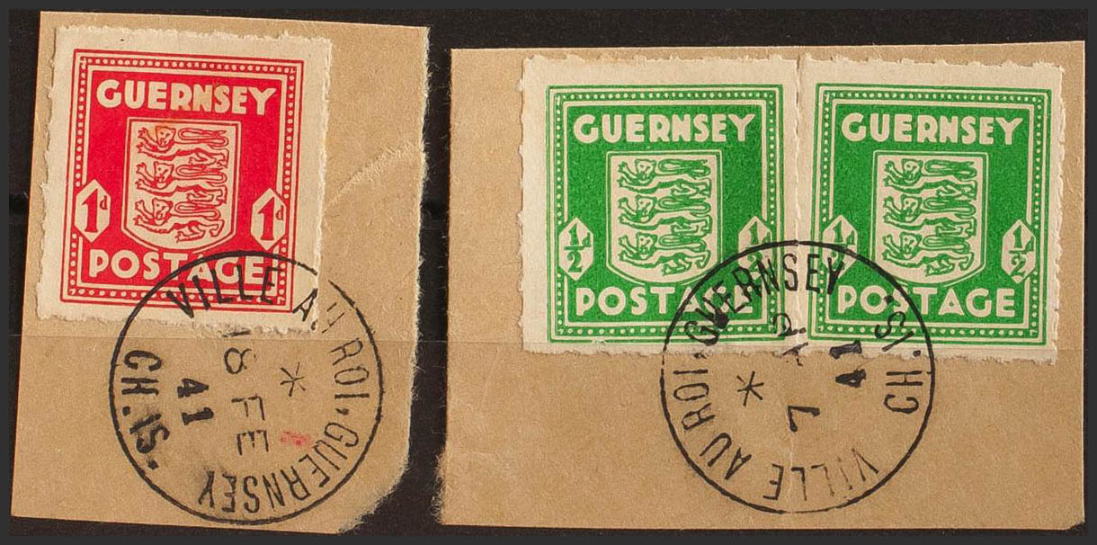 △ Yvert 1(2), 2. 1941. ½ p green, two fragment stamps and 1 red p, on fragment. Postmark VILLE AU ROI, GUERNSEY. MAGNIFICENT. (Mi1b, 2au)
