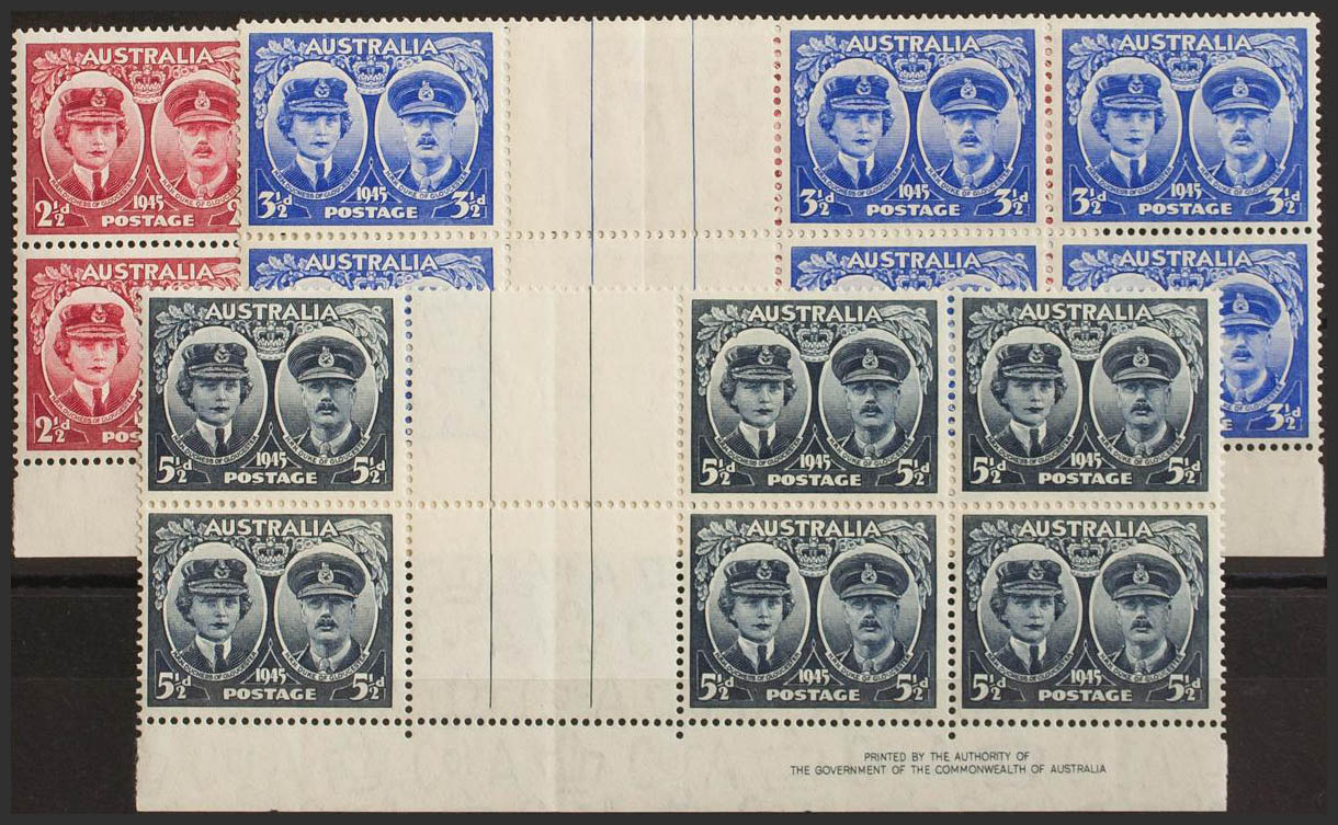 ★★Yvert 146/48(6). 1945. Complete series, in blocks of six with INTERPANEL and legend. MAGNIFICENT. (SG209/11)