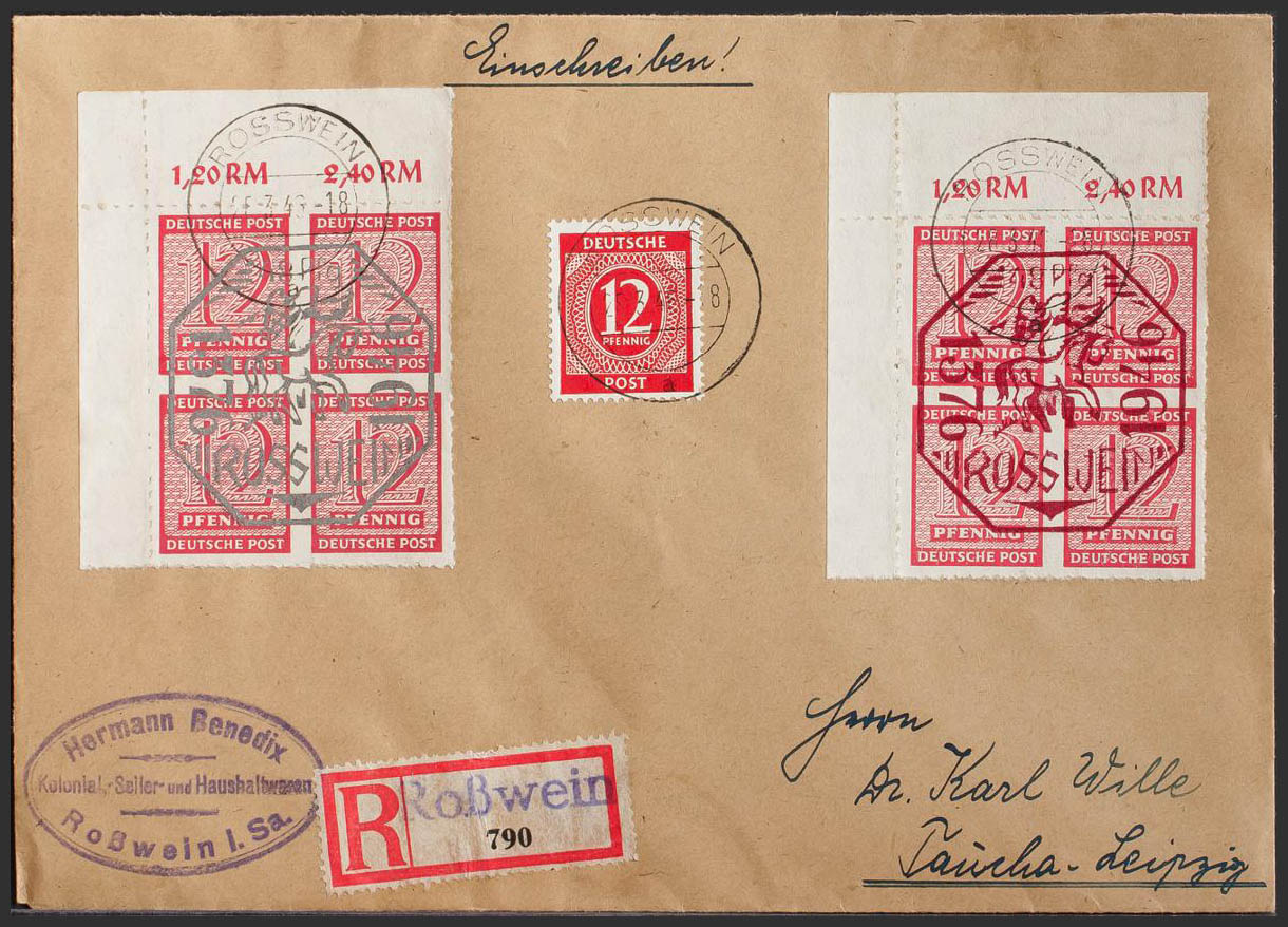 English 1946. Private. Rosswein. Complete series and 12 p red. Certificate from ROSSWEIN to TAUCHA (LEIPZIG). On the back arrival. MAGNIFICENT AND VERY RARE. (Mi1/2 +260 Euros)