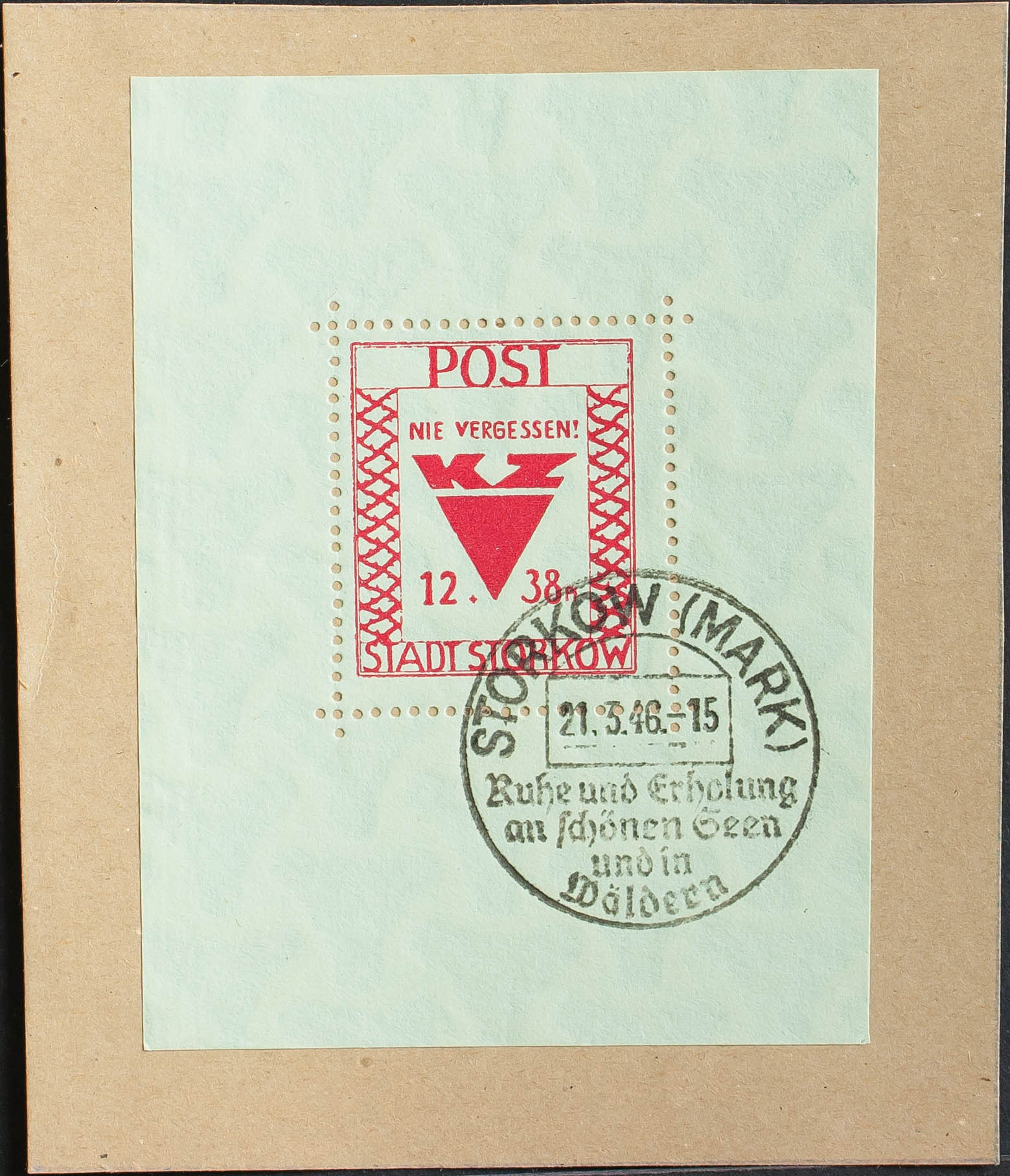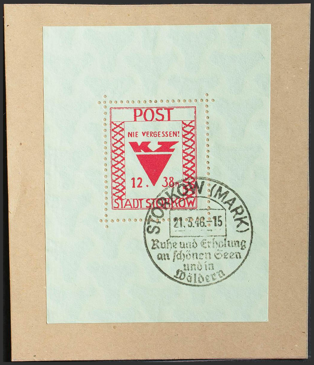 1946. Private. Sotorkow. 12 p+38 p carmine red on greenish paper. Watermark from top to bottom. Postmark STORKOW (MARK). MAGNIFICENT. (MiBl2AX 200 Euros)