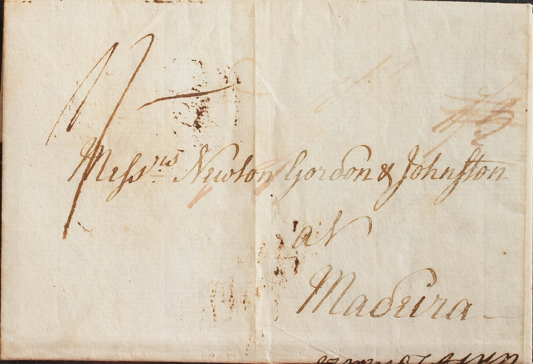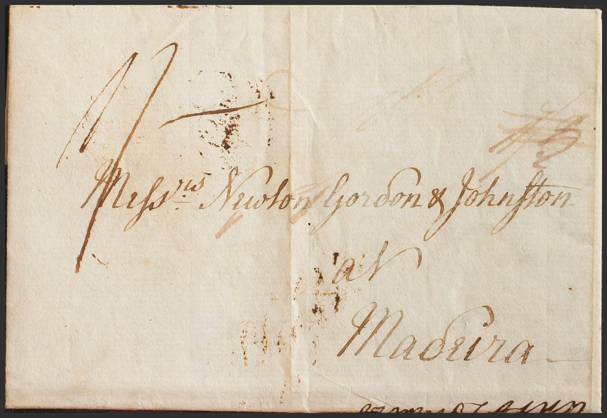 1787. GREAT SALT POND (JAMAICA) to MADEIRA. Handwritten porterage "1/3" rectified to "1/-", IAMAICA stamp on the back and SE / 20 / 87 date stamp, arrival in London where it is forwarded to its destination. MAGNIFICENT AND RARE DESTINATION FROM JAMAICA.